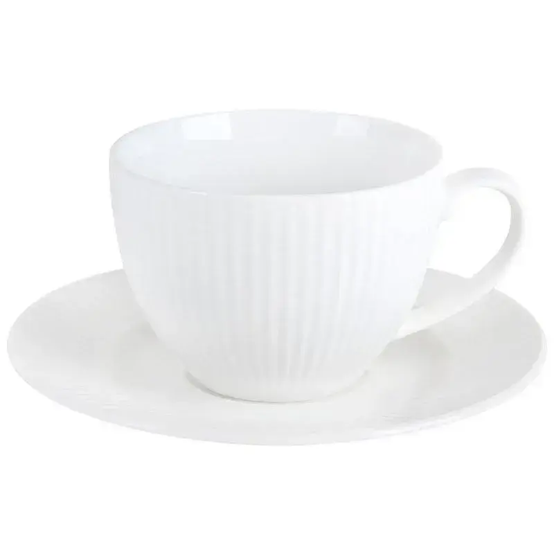 Чашка объемом 265 мл с ergonomic ручкой обеспечивает комфортный захват. Блюдце с рифлеными краями предотвращает скольжение и защищает поверхность стола. Универсальный белый цвет без декора легко сочетается с любой посудой и интерьерным стилем.