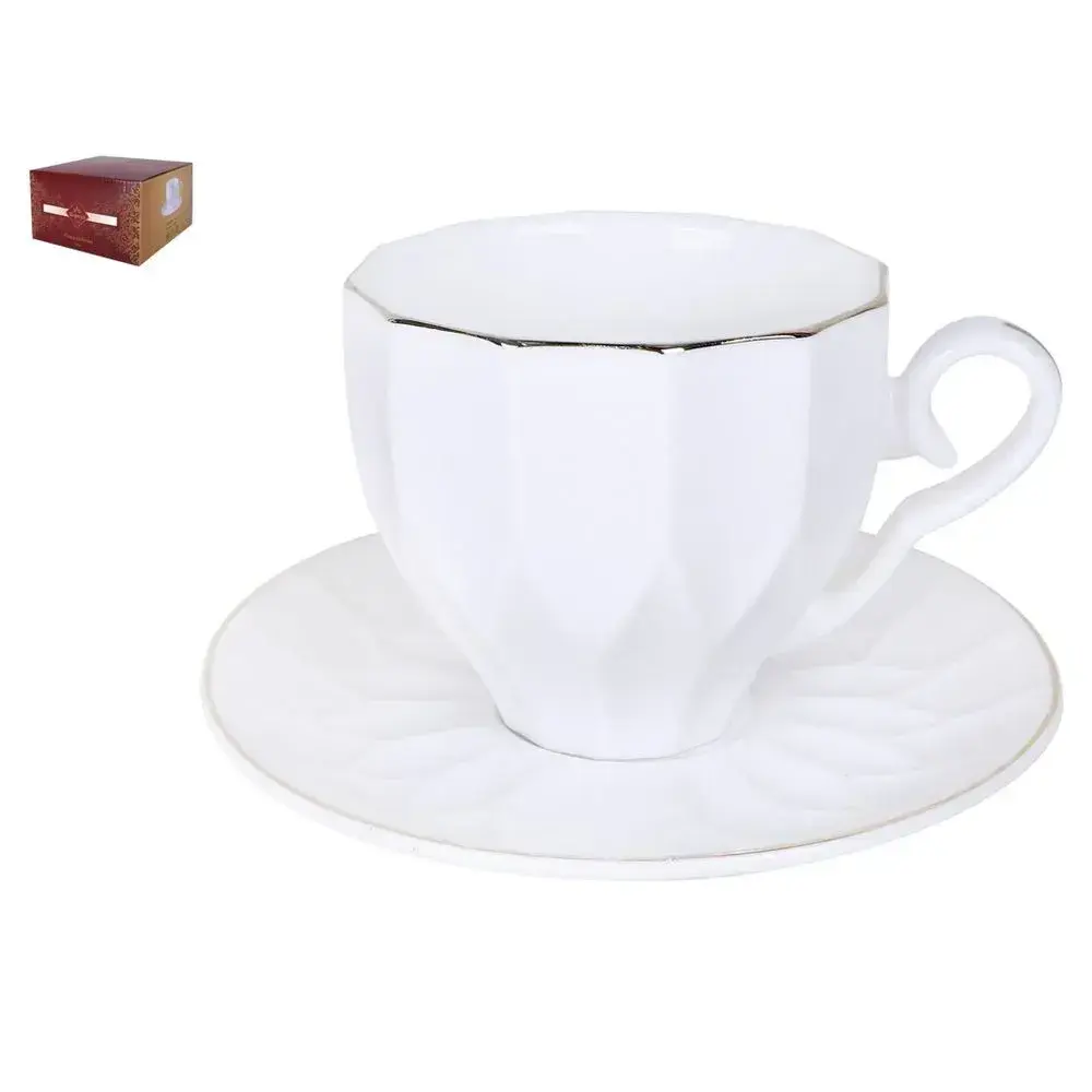 Ищете изящную пару для приятного чаепития, которая станет украшением любого стола? Чайная пара "Каприз" — это белоснежная классика, воплощённая в гладком фарфоре с утончённой серебристой каймой, которая дарит ощущение особого уюта и элегантности. Гранёная форма подчёркивает современный стиль, делая каждую чашку не просто предметом сервировки, а настоящим визуальным акцентом.