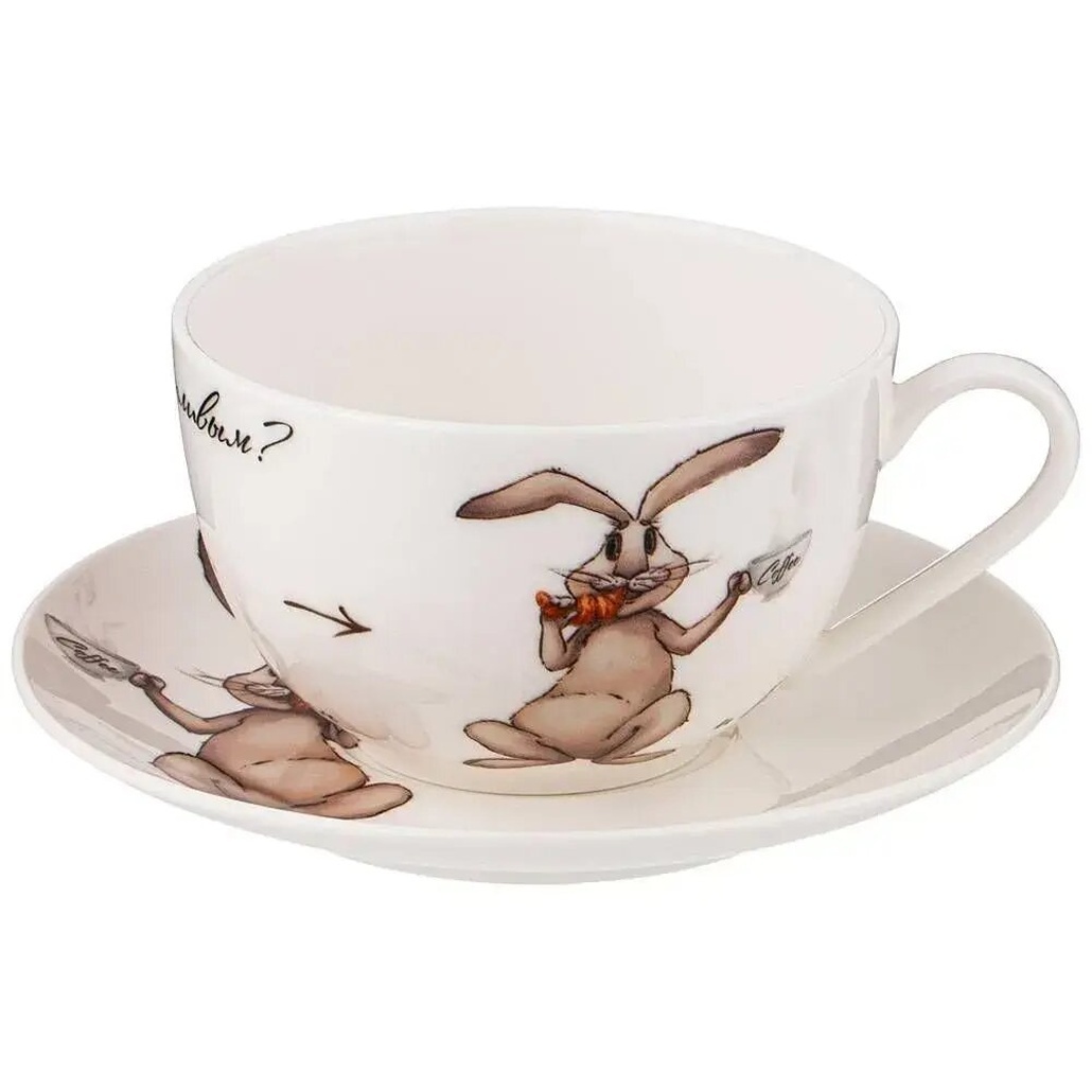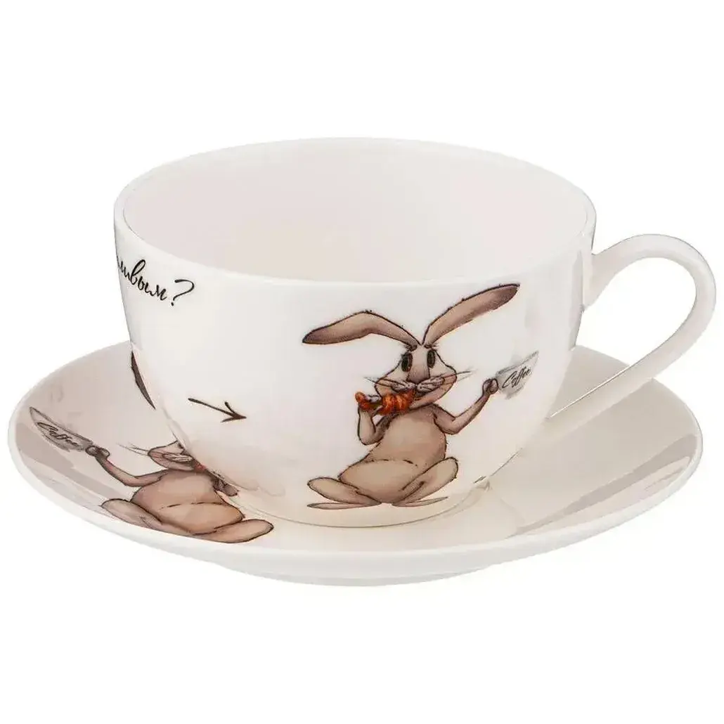 Эта чайная пара погрузит вас в атмосферу уюта и радости, благодаря мультипликационному рисунку – милый кролик с морковкой в лапах добавит настроения каждому завтраку или вечеру. Стрелка на чашке направляет внимание на героя композиции, делая этот комплект не просто посудой, а источником вдохновения и тепла в доме.