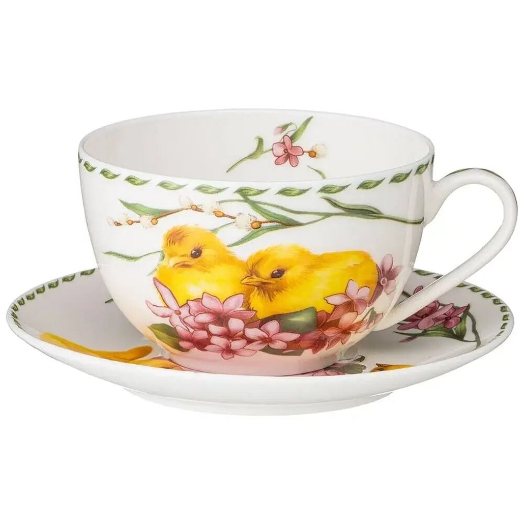 Чайная пара "Sunday" lefard 300 мл, фарфоровая, дизайн с птицами и цветами, зеленая кайма