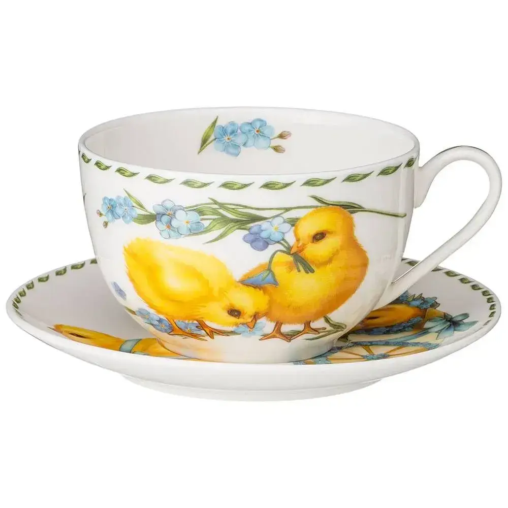 Комплект из фарфоровой чашки и блюдца с очаровательным дизайном создаст особую атмосферу чаепития. Нежный рисунок с цыплятами и цветочными мотивами подарит ощущение уюта и гармонии с природой.