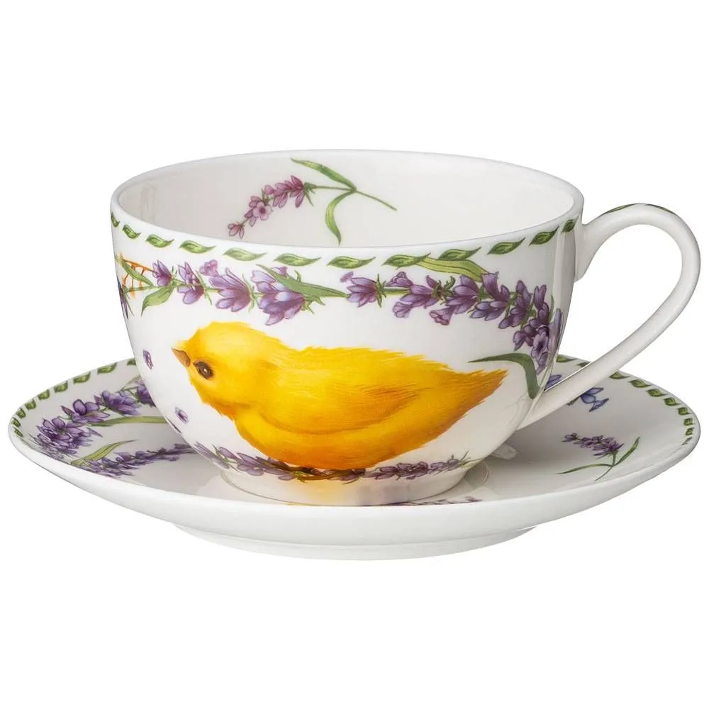 Чашка удобно лежит в руке благодаря аккуратной изогнутой ручке и сбалансированной форме. Объём 300 мл оптимален для чая, кофе, какао и других горячих напитков. Блюдце с приподнятым краем дополняет комплект и подходит для подачи десертов, печенья или ложечки.
