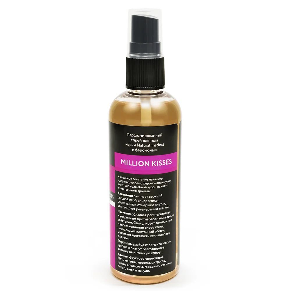 Парфюмированный спрей 'Million Kisses' создан для тех, кто хочет подчеркнуть свою чувственность и уверенность. Благодаря уникальной формуле с натуральными феромонами, этот аромат станет вашим секретным оружием привлекательности.