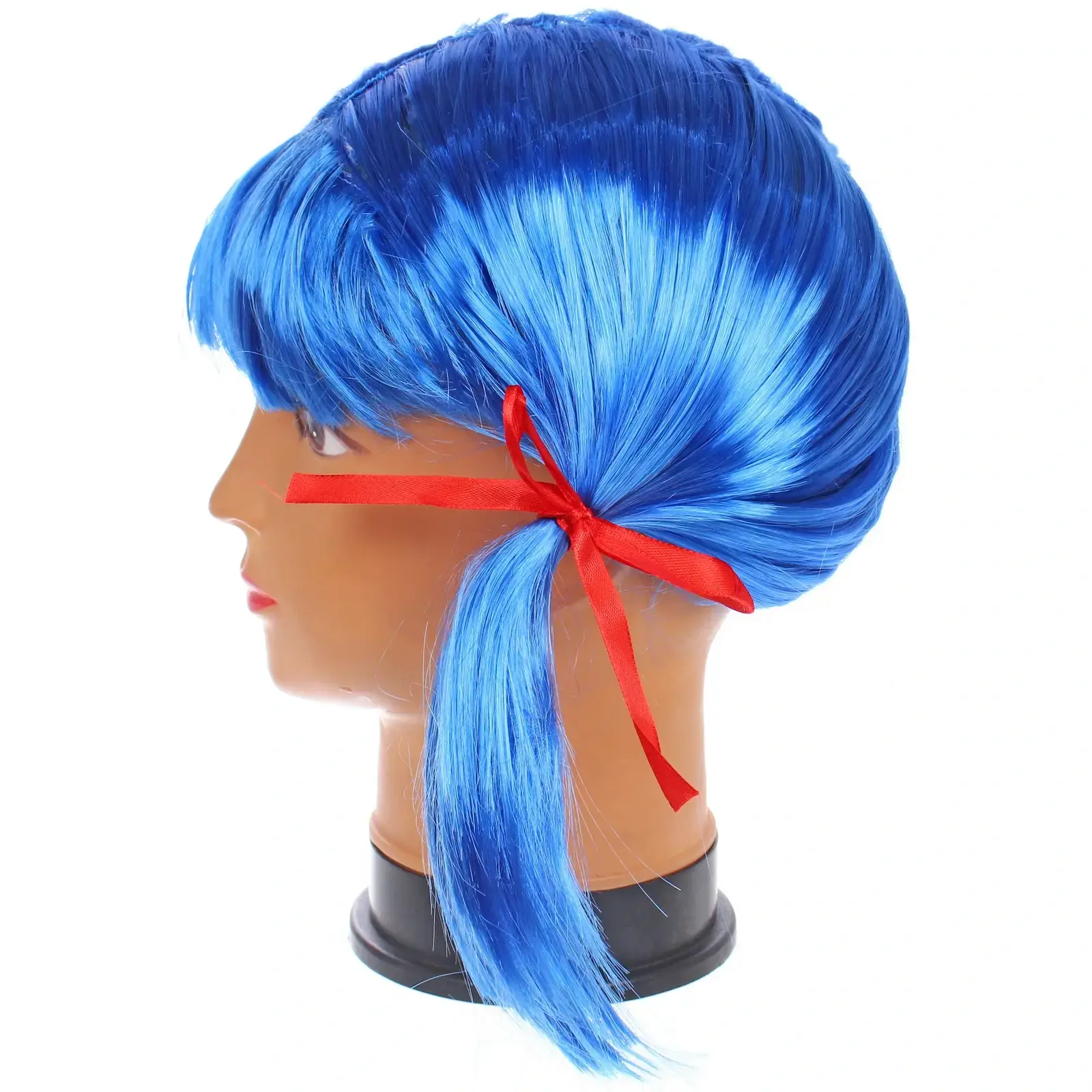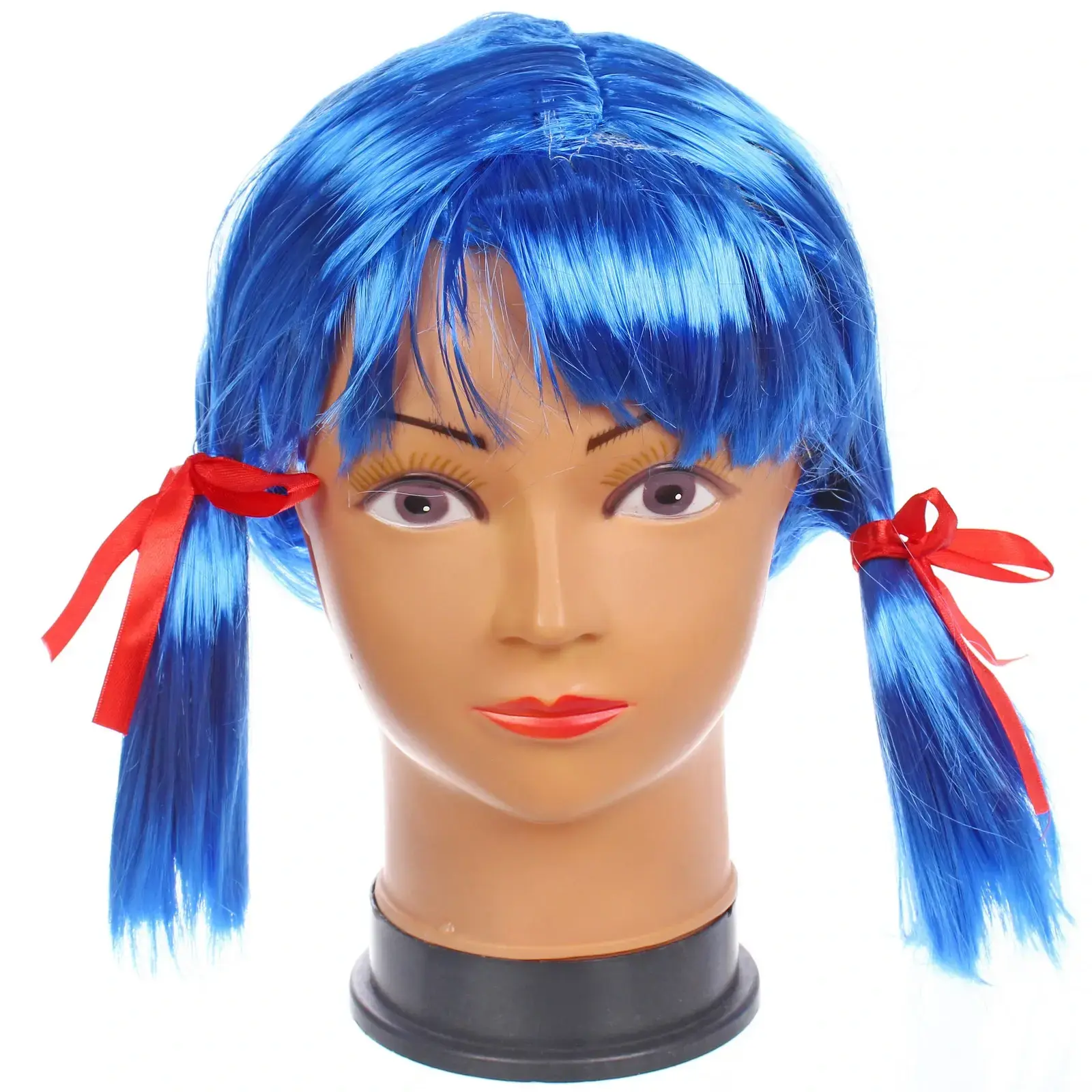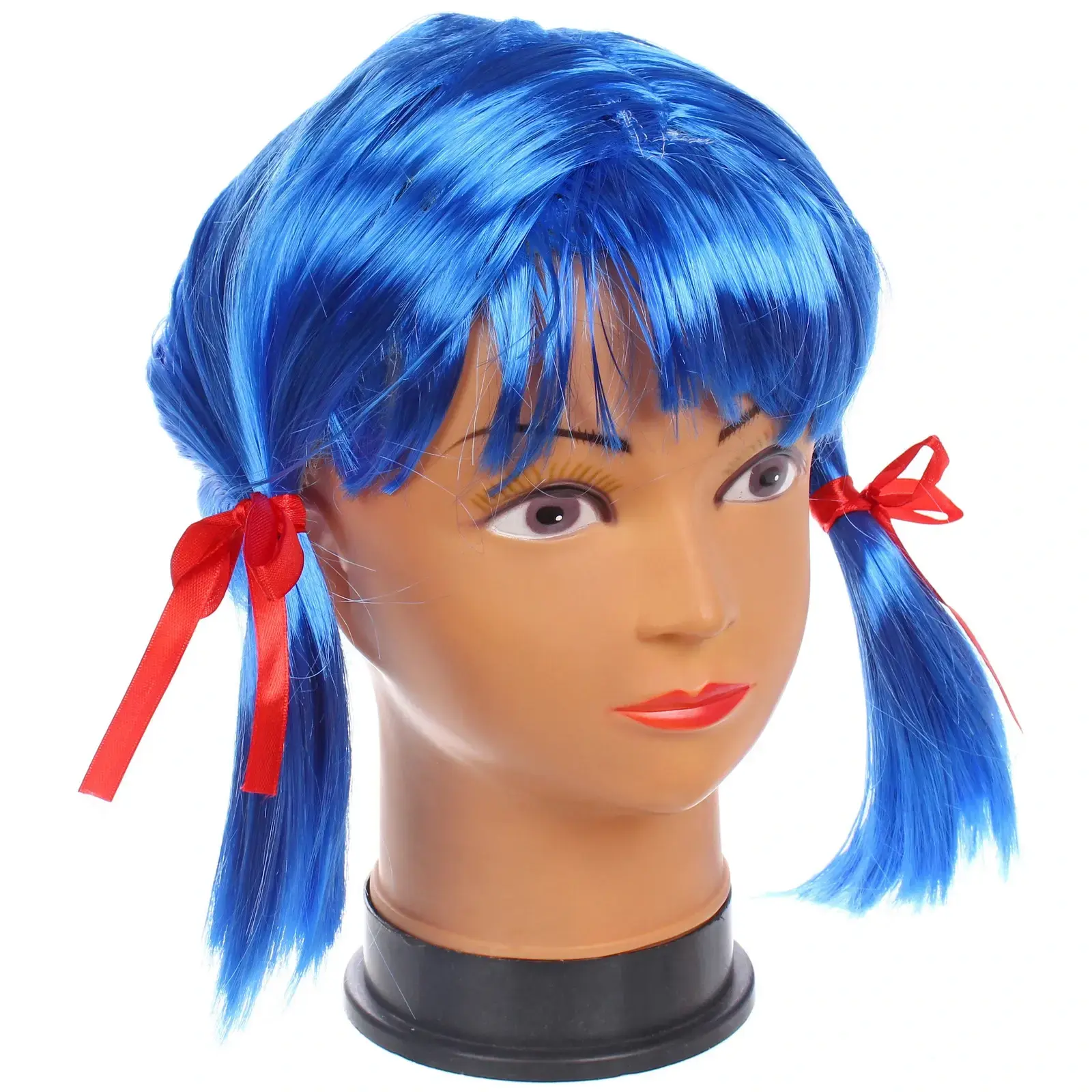 Длина волос парика средней, что позволяет создавать различные прически. Он представлен в ярко-синем цвете, который будет отлично смотреться на любом фоне. Красные ленты, завязанные в косички, добавляют яркий акцент и делают парик еще более привлекательным. Этот парик станет отличным выбором для всех, кто хочет добавить немного веселья и яркости в свою жизнь.