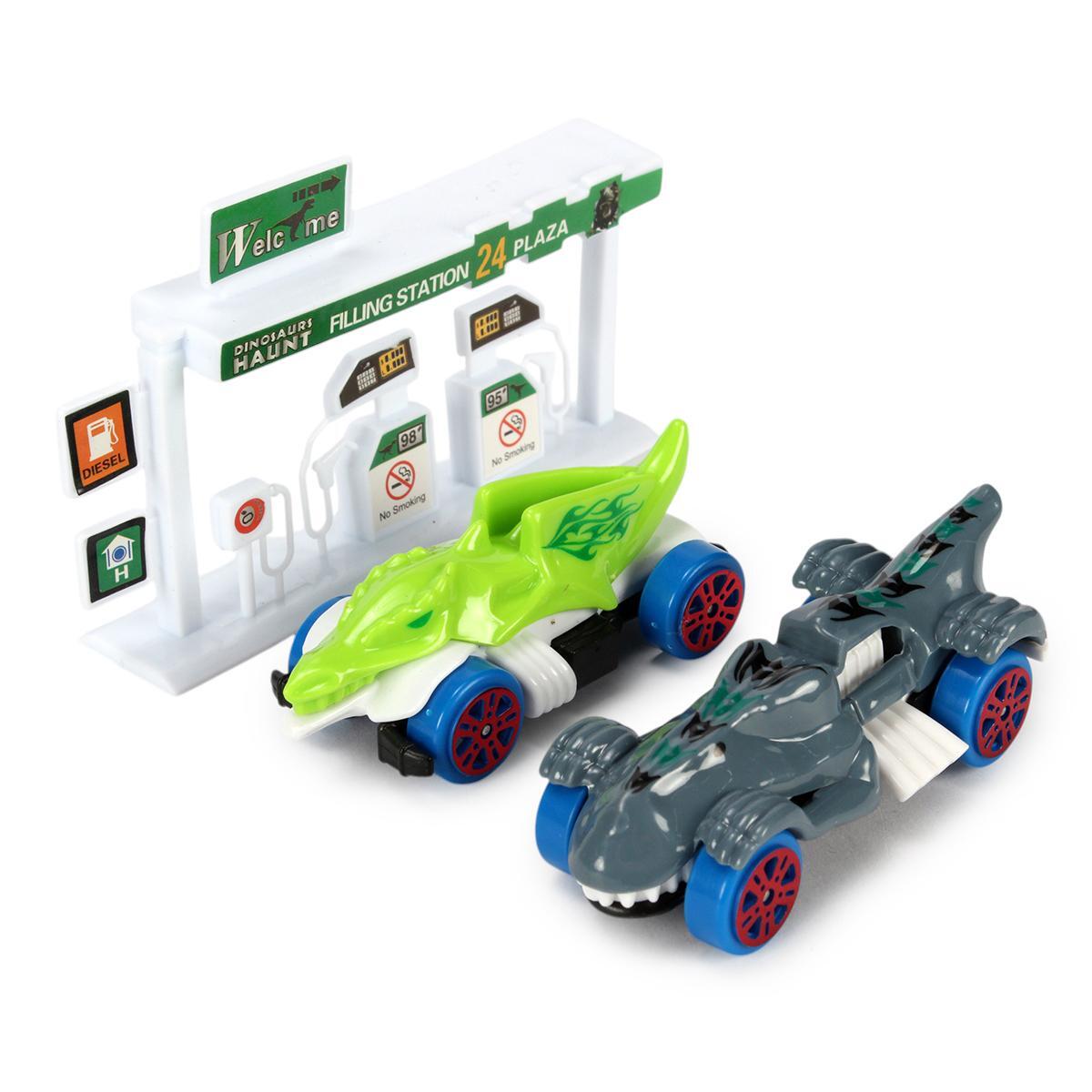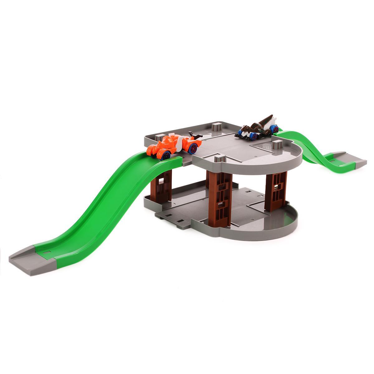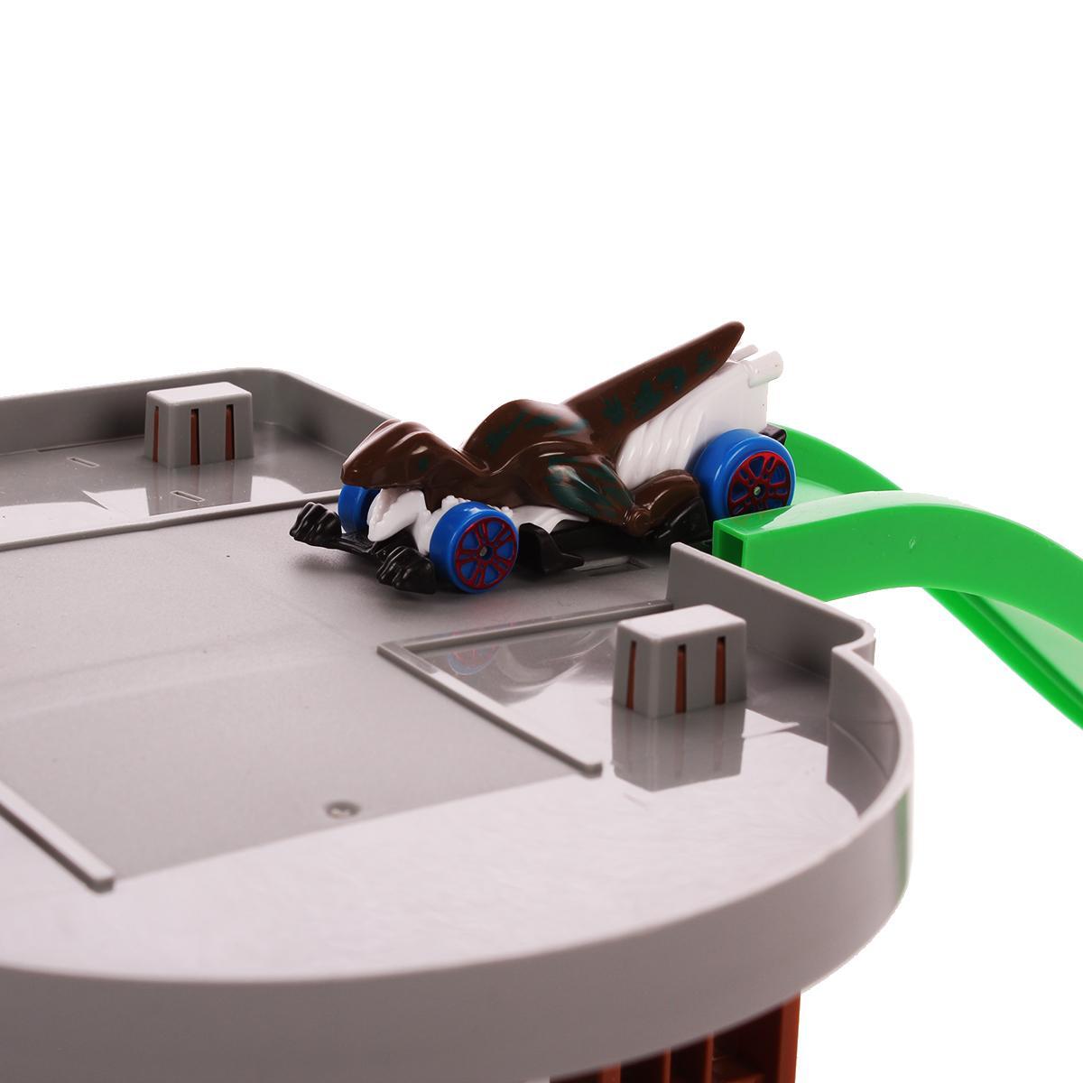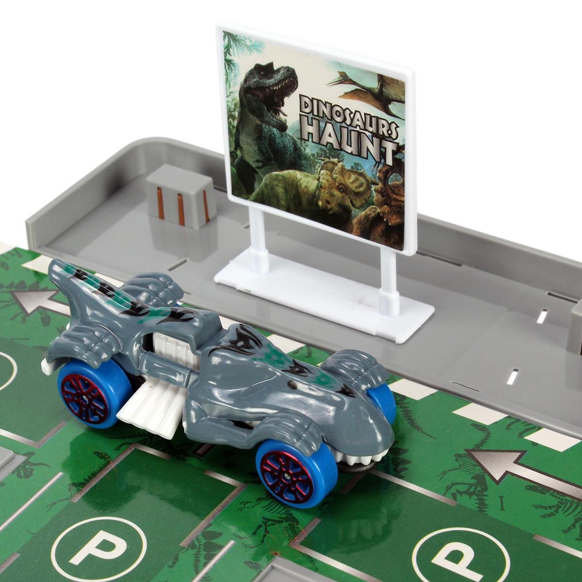 Размер упаковки: 36.5х27.3х5.5 см. Материал: пластик. В наборе есть все необходимое для полноценной игры: знаки, парковочные места и даже декоративные баннеры с изображениями динозавров.