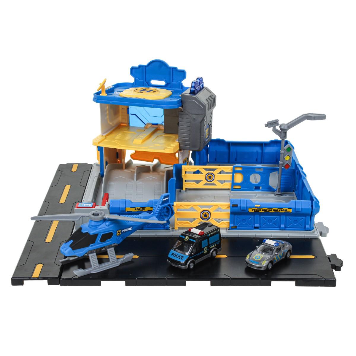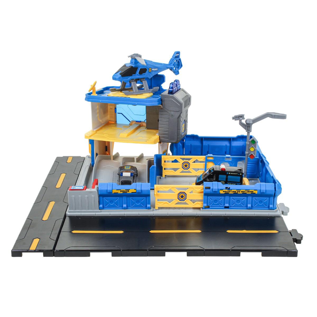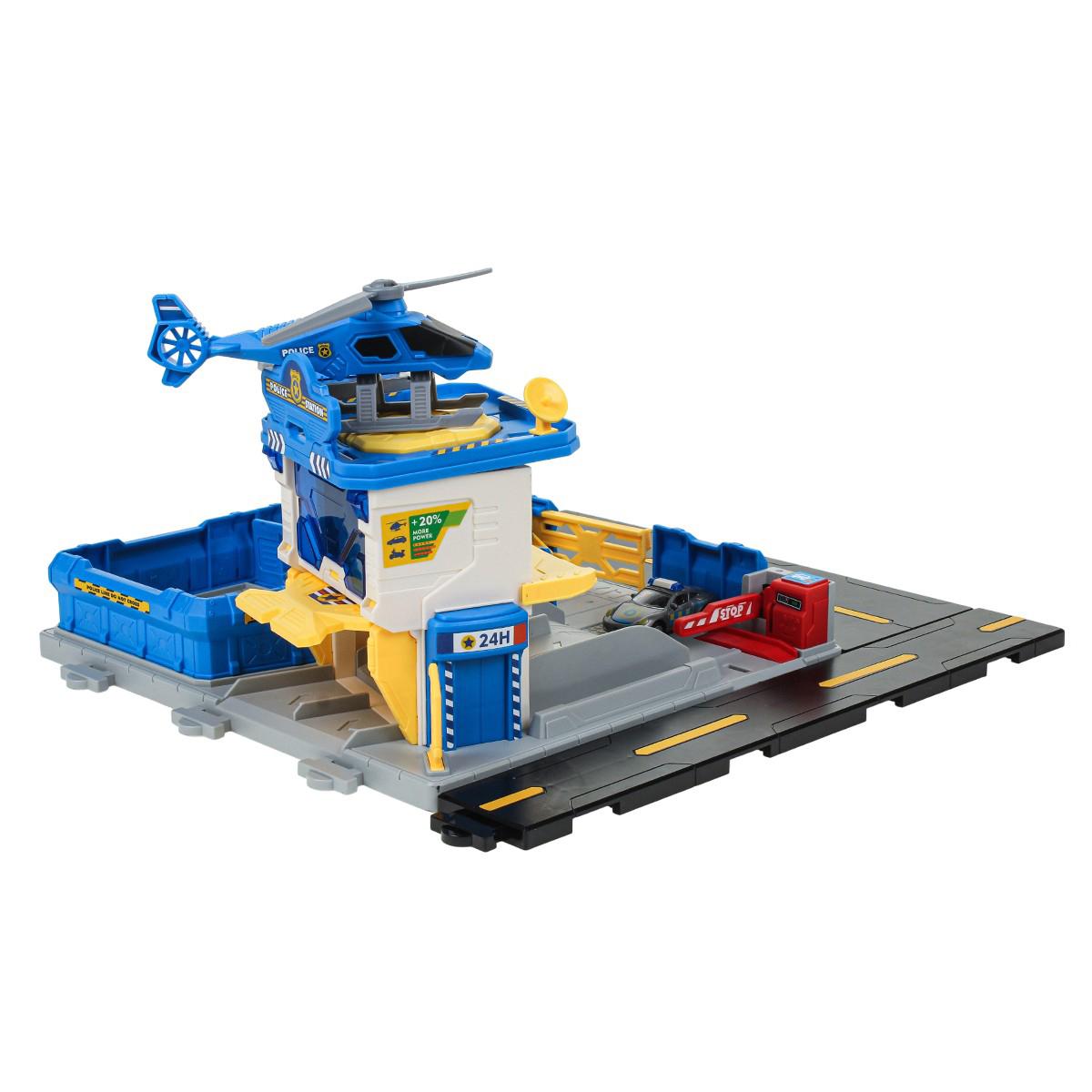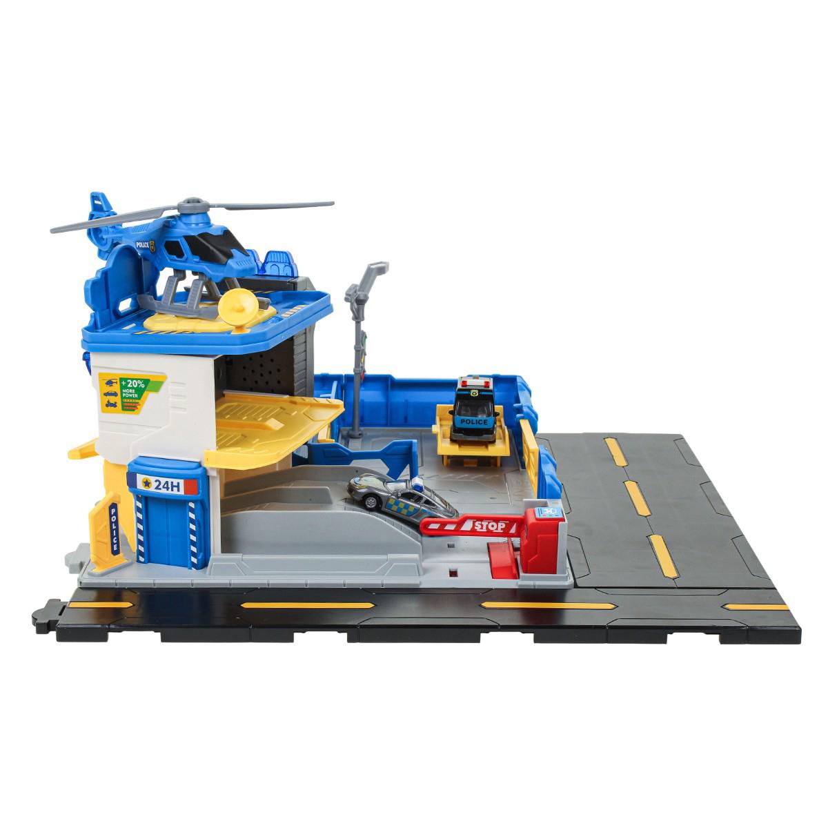 На просторной платформе с дорожной разметкой расположена многоуровневая полицейская станция. В комплекте есть несколько машинок полицейской тематики и вертолет. Ребенок может: