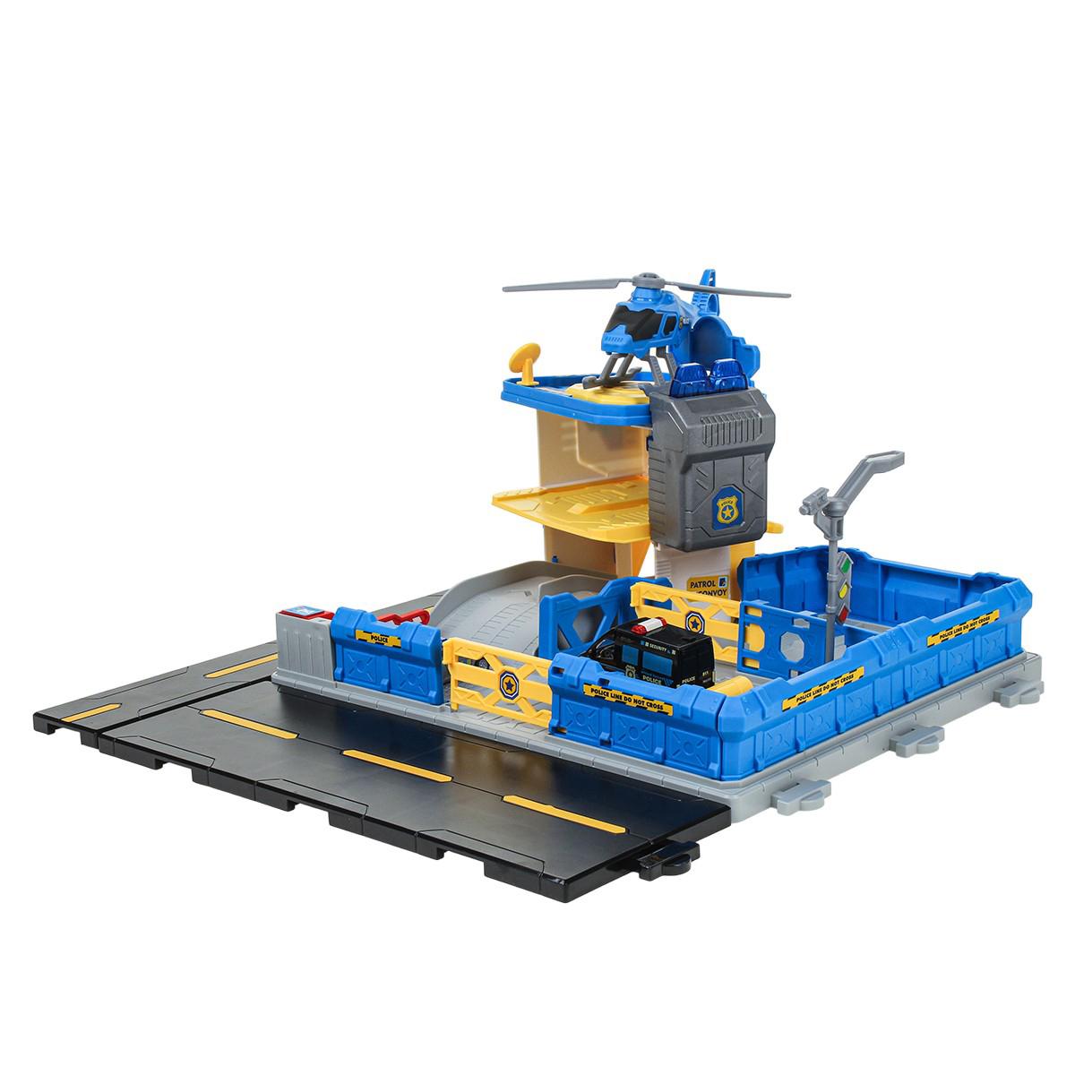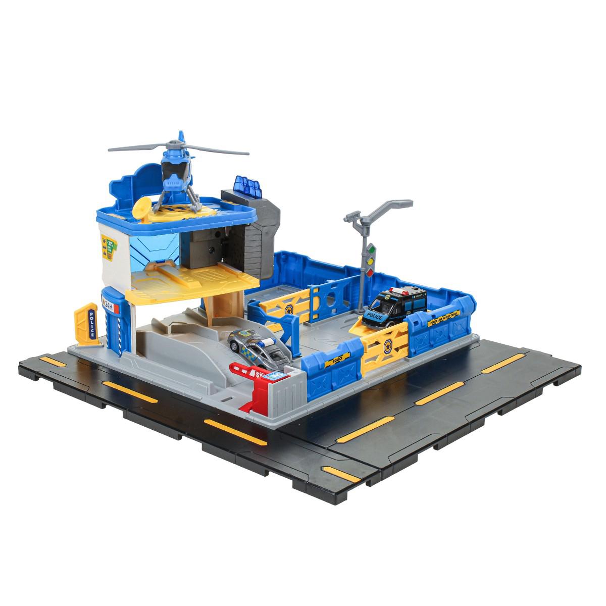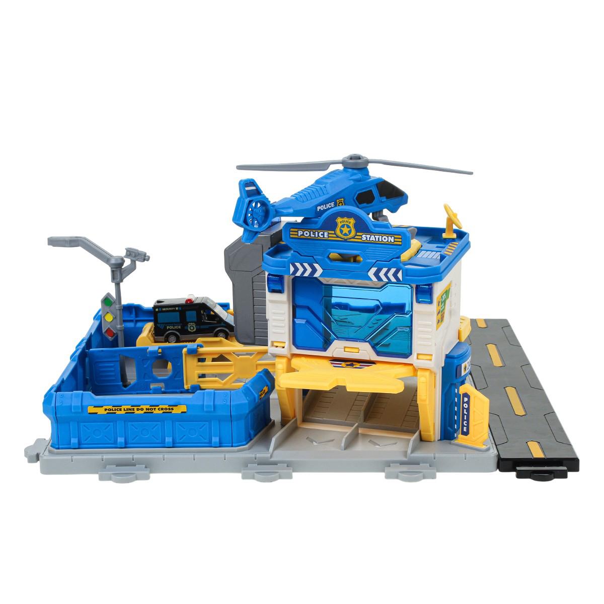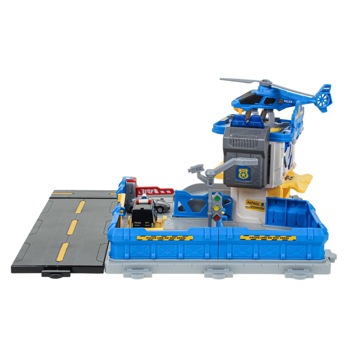 На просторной платформе с дорожной разметкой расположена многоуровневая полицейская станция. В комплекте есть несколько машинок полицейской тематики и вертолет. Ребенок может: