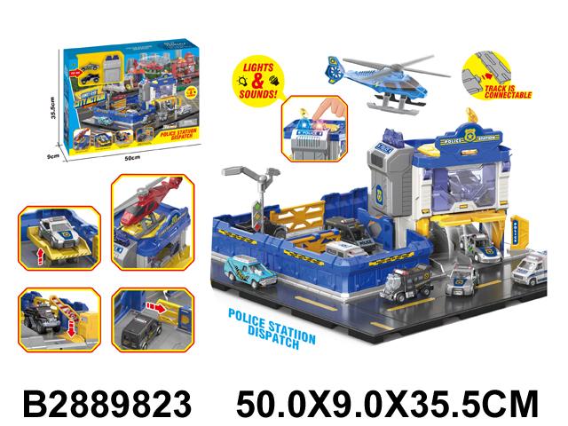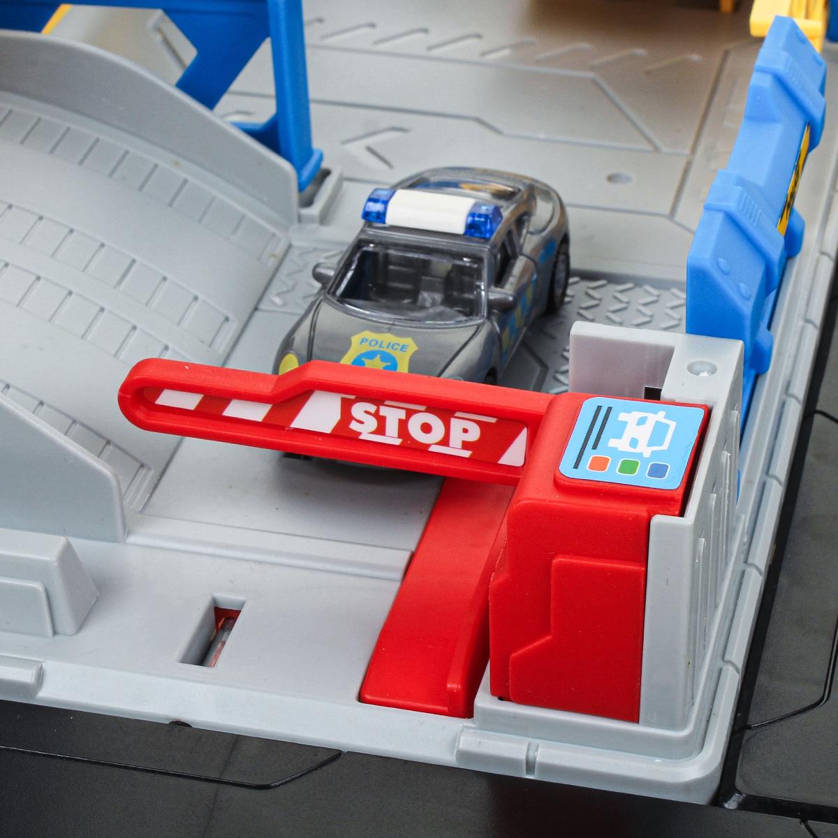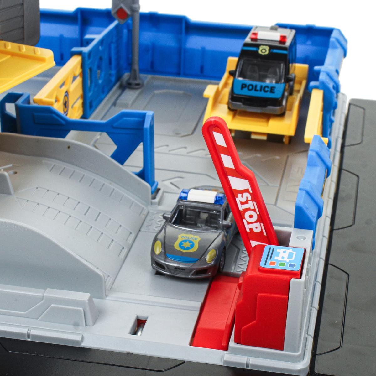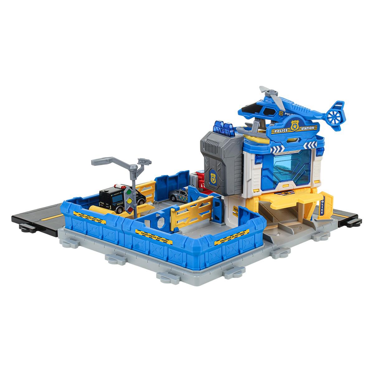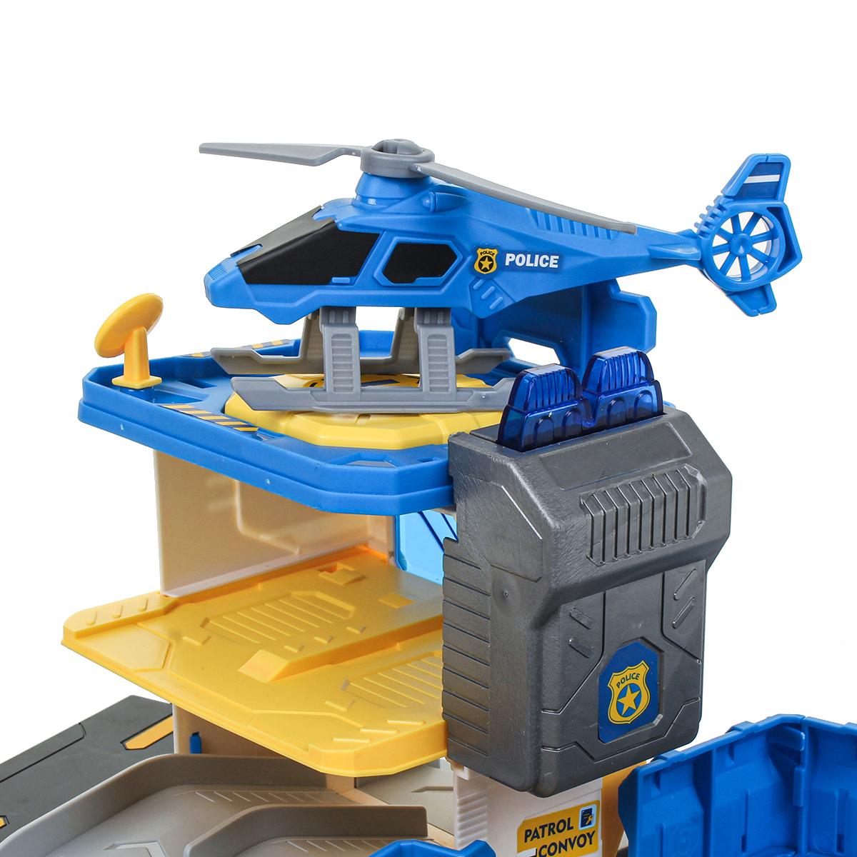 На просторной платформе с дорожной разметкой расположена многоуровневая полицейская станция. В комплекте есть несколько машинок полицейской тематики и вертолет. Ребенок может: