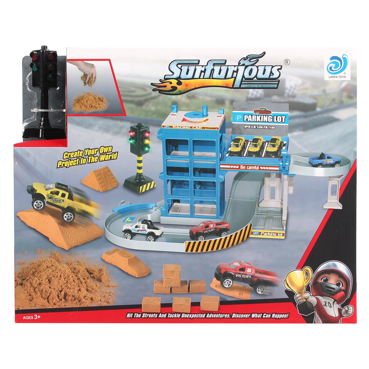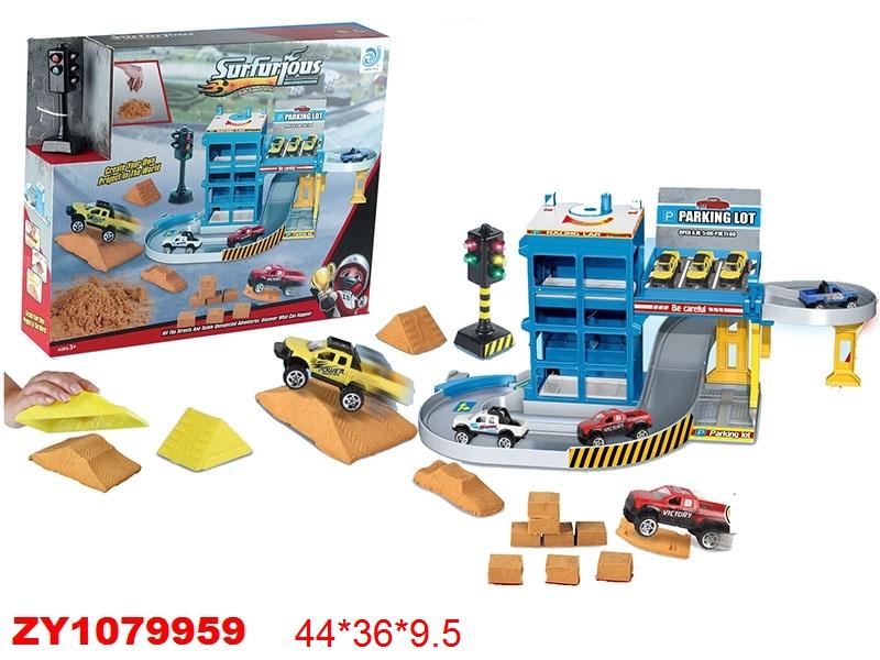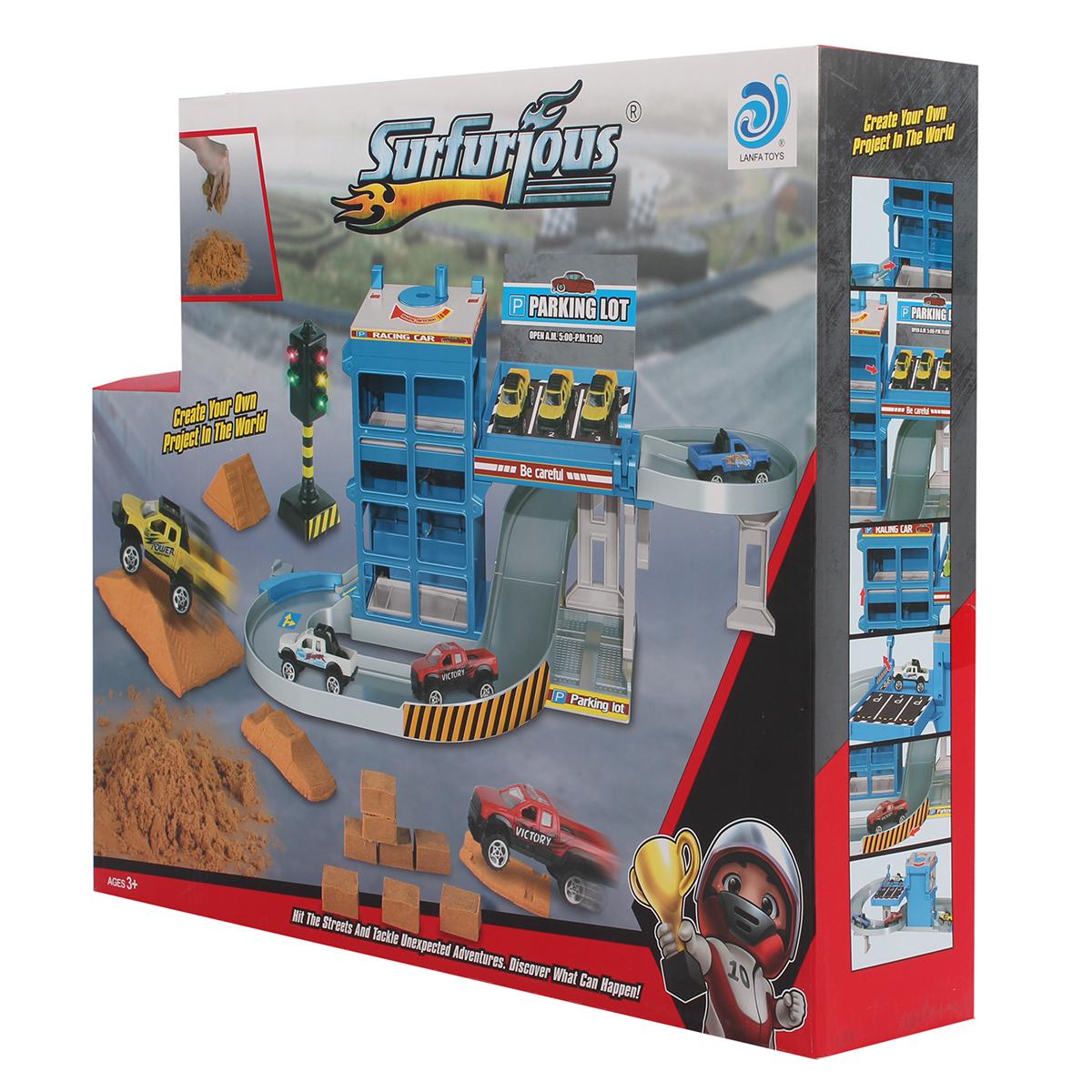 Парковка включает в себя 9 деталей для постройки, светофор с автоматическим переключением и звуковым сигналом, а также машинку в комплекте. Лифт поднимает машинку на второй уровень, а кнопка автоматического опускания позволяет легко возвращать её обратно. С помощью формочек для песка можно создать холмы и горки, добавляя элементы ландшафта в игру.