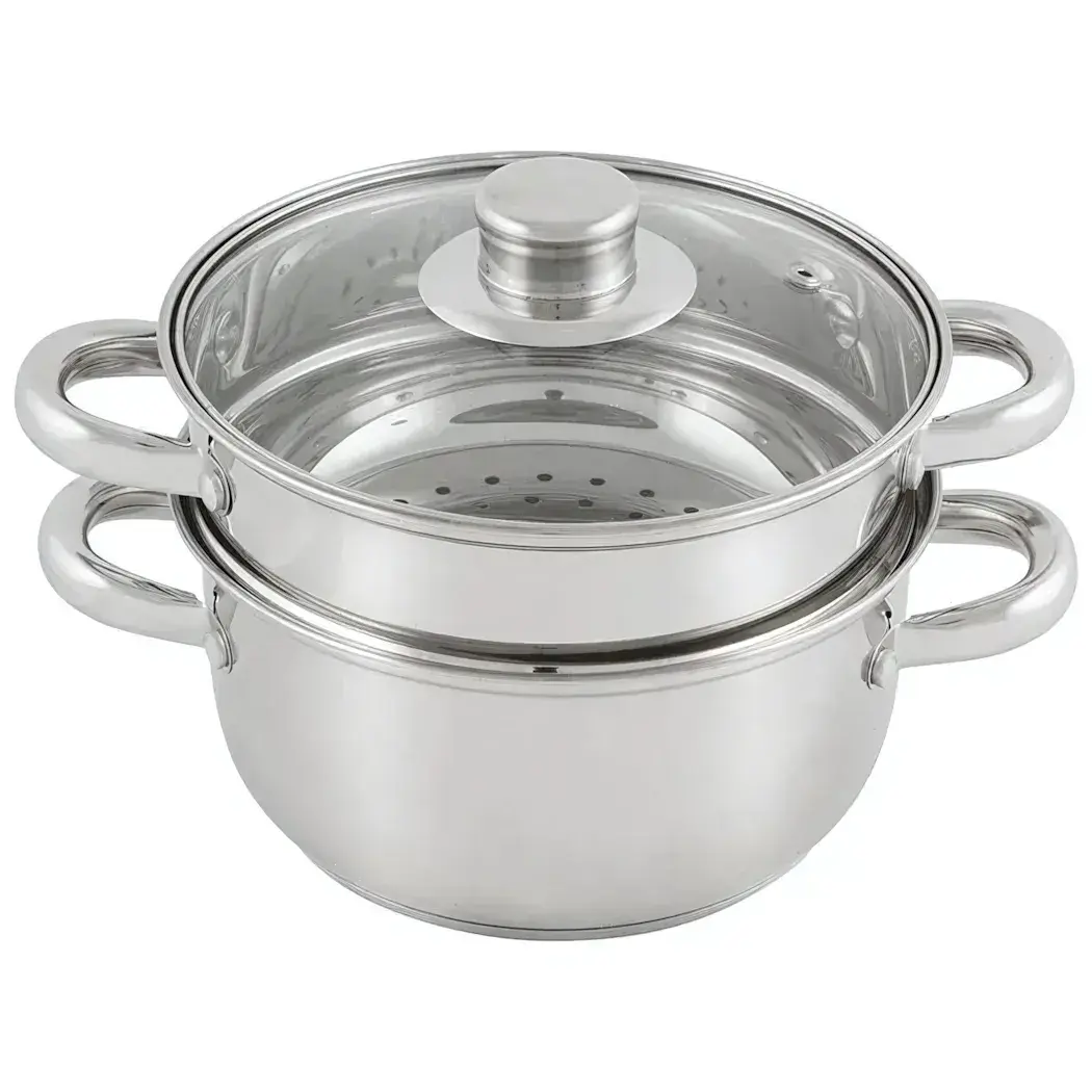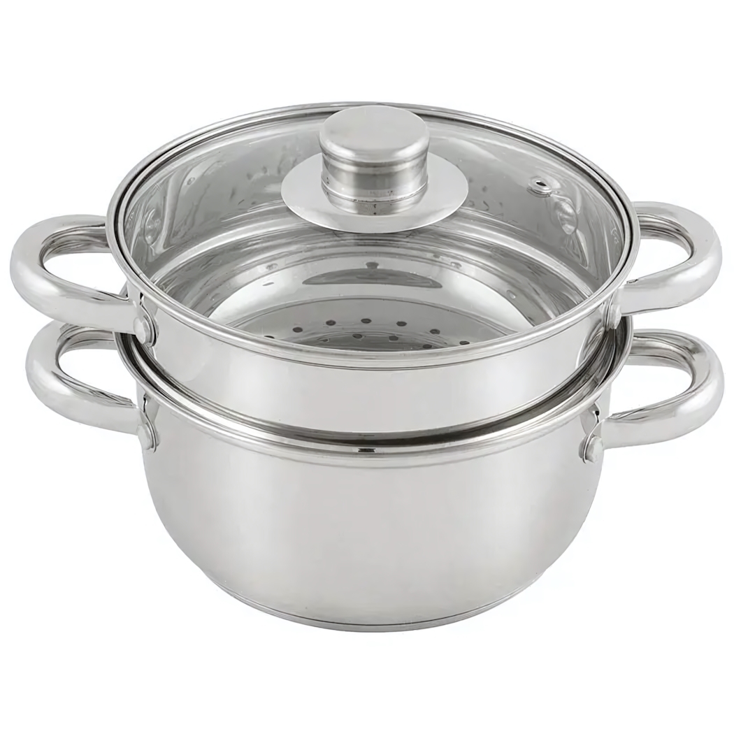 Общий объем 2.5 литра распределен между двумя уровнями для оптимального использования пространства. Толщина стенок 0.8 мм обеспечивает равномерный нагрев, а зеркальная полировка поверхности упрощает уход. Совместимость с посудомоечной машиной делает эксплуатацию максимально удобной.
