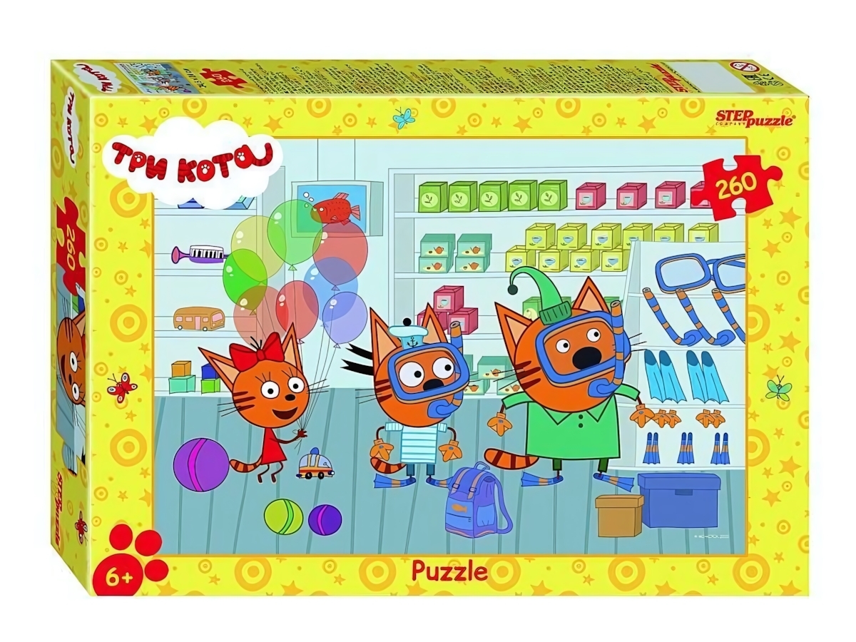 Откройте для ребёнка мир мультсериала «Три кота» в виде пазла с 260 деталями, размером 345 × 240 мм. Эти яркие и красочные элементы создают насыщенный образ любимых персонажей – Коржика, Карамельки и Компота.