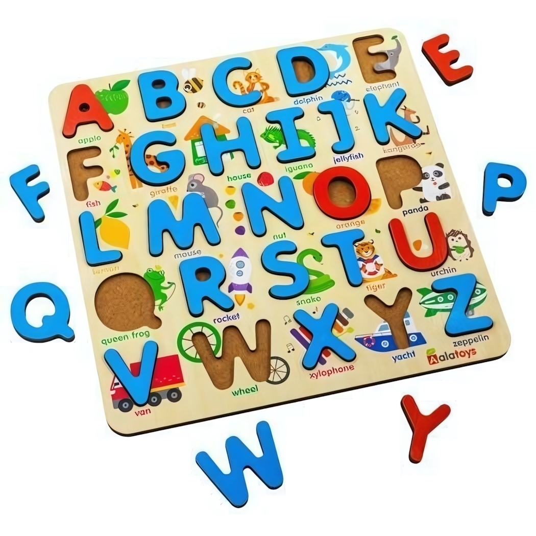 Пазл состоит из квадратной основы с 26 углублениями для букв, каждая из которых имеет свою уникальную форму и цвет. Играя с пазлом, дети учатся распознавать буквы и ассоциировать их с предметами, что делает процесс обучения более эффективным. Пазл подходит для детей от 3 лет и старше, что делает его отличным подарком для малышей.