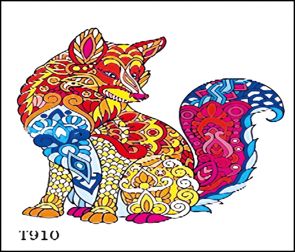 - Уникальный дизайн: стилизованная лиса с анатомически точными формами и красочными узорами