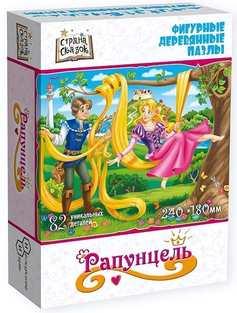 Пазл состоит из 82 уникальных деталей, каждая из которых выполнена в форме предметов, связанных с тематикой сказки о Рапунцель. Размер упаковки составляет 240 x 180 мм, что делает его удобным для хранения и транспортировки. Пазл станет отличным подарком для любителей сказок и настольных игр.