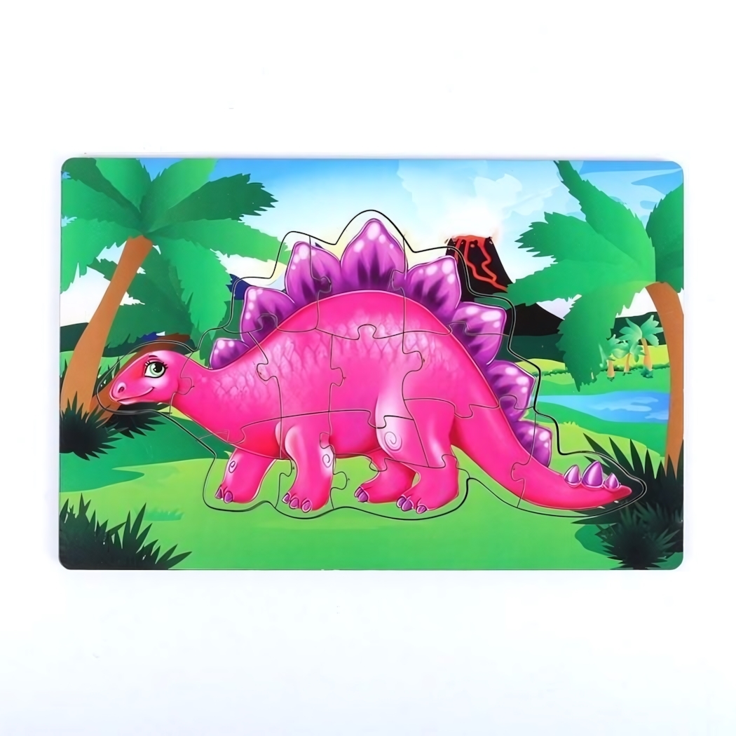 Пазл включает 15 элементов, выполненных из экологически чистых материалов: дерево с бумажными вкладышами. Благодаря яркому дизайну с изображением динозавра и доисторического пейзажа, ребенок получает возможность познакомиться с животными эпохи динозавров, развивая фантазию и воображение.