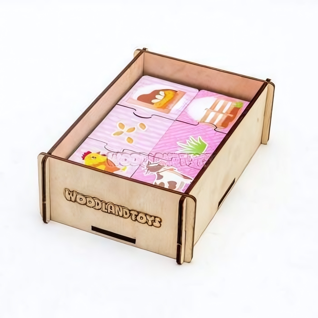Пазл-набор состоит из 12 пар деталей, которые удобно хранятся в аккуратной деревянной коробке. Игра с пазлом проста: ребенку нужно найти и соединить соответствующие изображения, что делает процесс обучения интересным и занимательным. Этот набор подходит для детей от 3 лет и старше, что позволяет использовать его как в домашних условиях, так и в образовательных учреждениях.