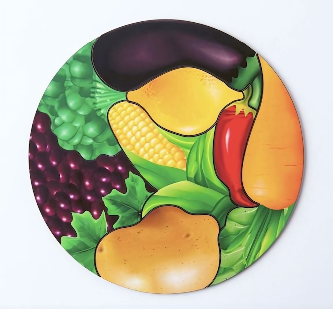 Яркие изображения овощей (баклажан, морковь, перец) выполнены методом шелкографии, что гарантирует чёткость линий и долговечность рисунка. Пазл можно использовать как основу для творческих занятий: обводить элементы, создавать аппликации или изучать счет.