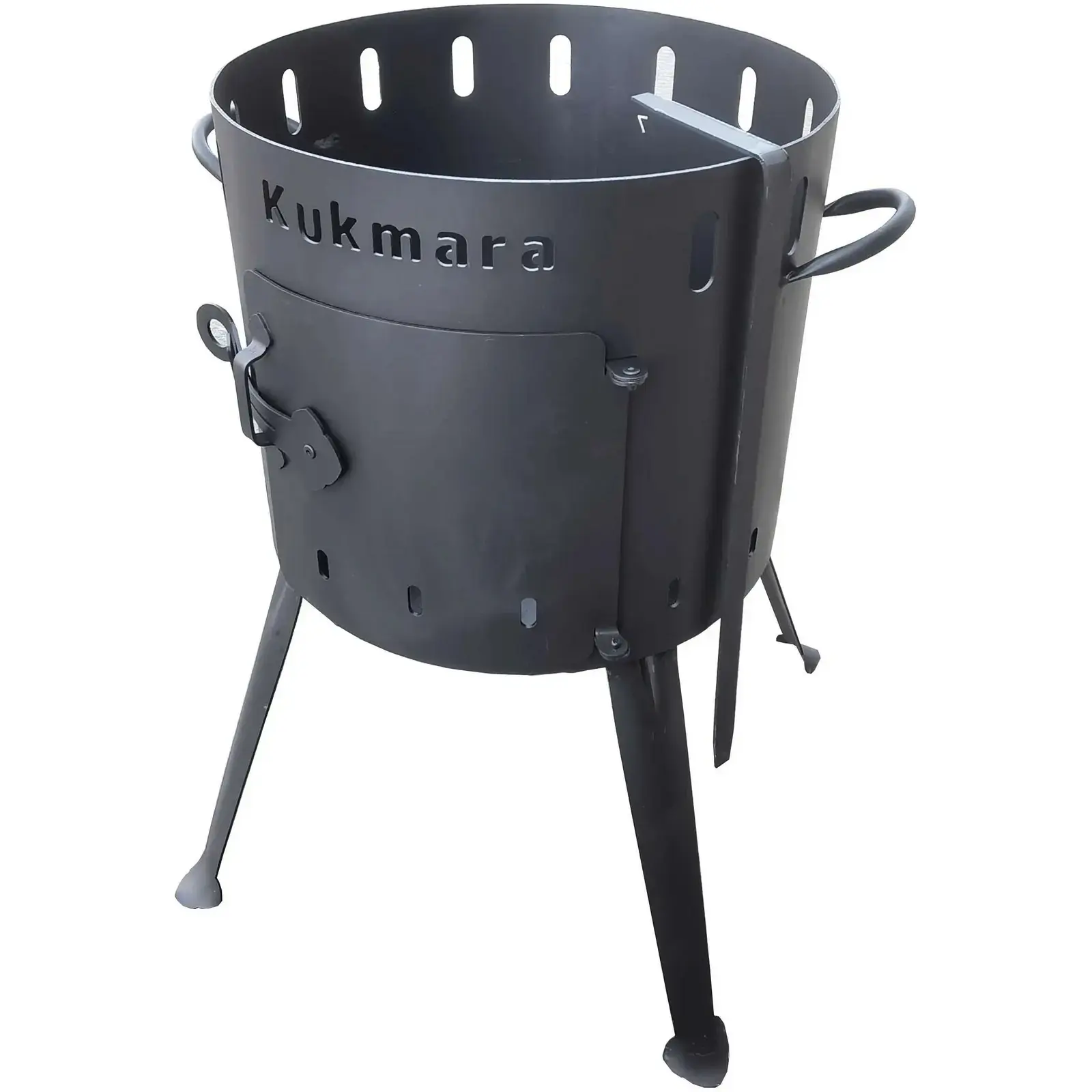 Печь легко помещается в багажник автомобиля и весит немного, что делает её идеальной для активного отдыха. Конструкция предусматривает вентиляционные отверстия, обеспечивающие стабильное горение. В комплект входят дверца, съемные ножки и кочерга. Отличный выбор для приготовления плова, тушёного мяса, овощей или любого другого блюда в казане.