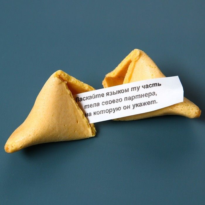 Печенье выполнено в ярком красном цвете с белыми и черными элементами дизайна, что делает его привлекательным на вид. Упаковка содержит текст, который подчеркивает развлекательный характер продукта. Печенье имеет форму 'печенья счастья' и обладает хрустящей текстурой, что делает его не только интересным, но и вкусным.