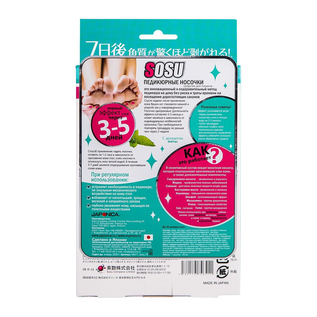 Забудьте о грубой коже, натоптышах и необходимости посещать салон. Инновационные педикюрные носочки SOSU с ароматом мяты – это революционный способ сделать ваши ножки гладкими, ухоженными и невероятно мягкими всего за одну процедуру. Разработанные японскими специалистами, они дарят эффект салонного педикюра, не выходя из дома.