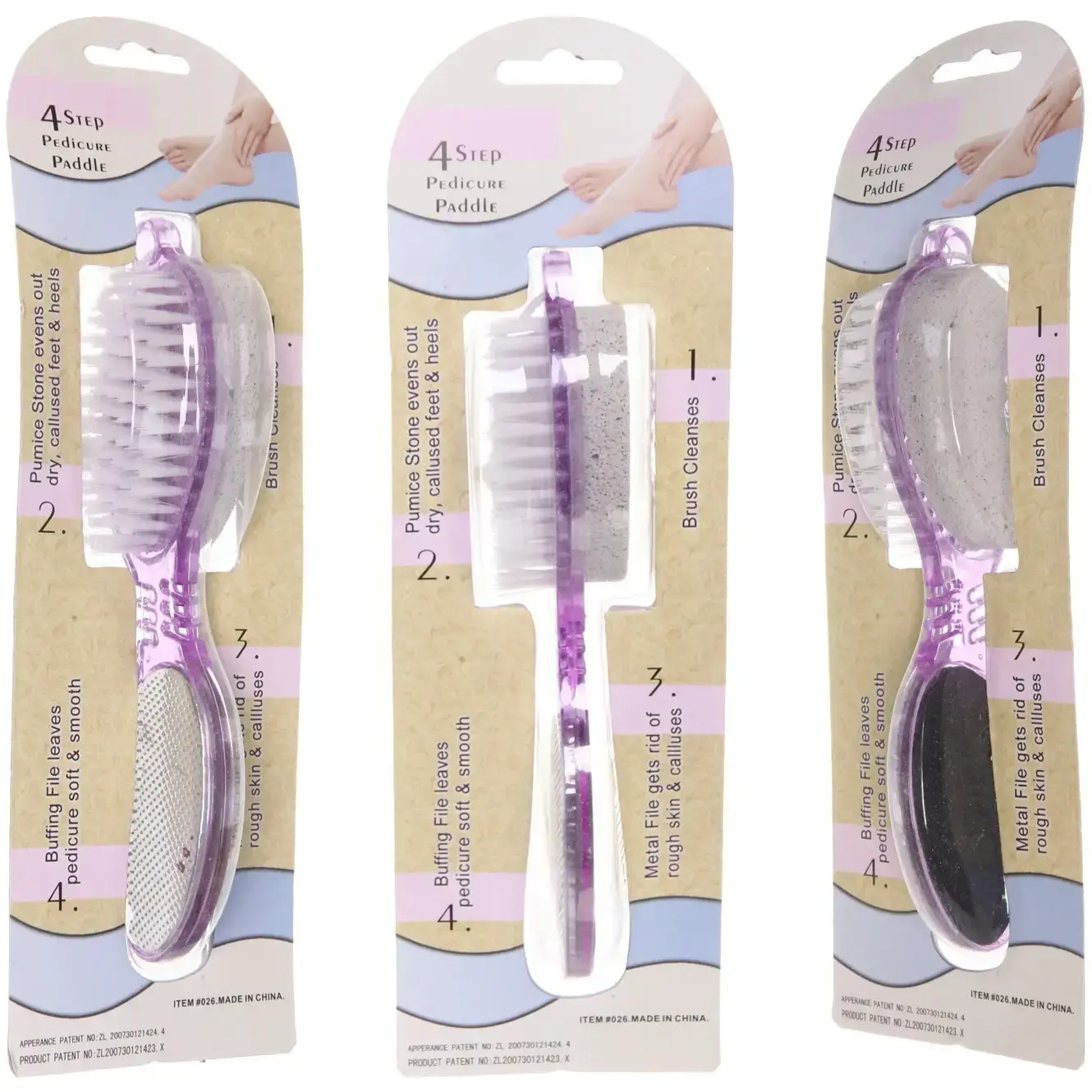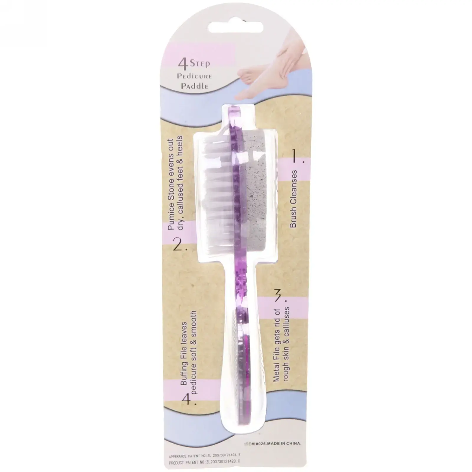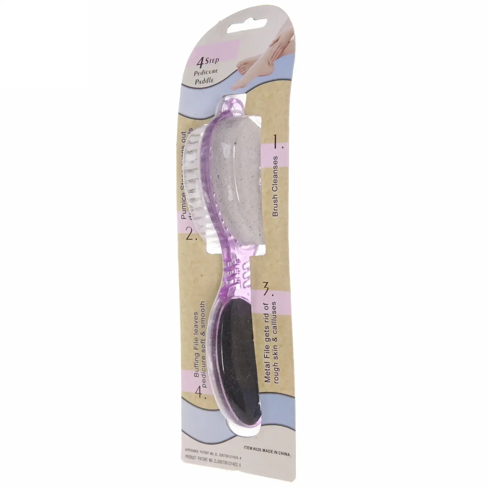 Пемза оснащена четырьмя различными рабочими поверхностями: щеткой для очищения, пемзой для выравнивания, металлической пилкой для удаления ороговевшей кожи и шлифовальной стороной для полировки. Это делает её универсальным инструментом для педикюра, который подходит для всех типов кожи. Используйте пемзу в четыре этапа: сначала очистите, затем выровняйте, полируйте и, наконец, удалите грубую кожу.
