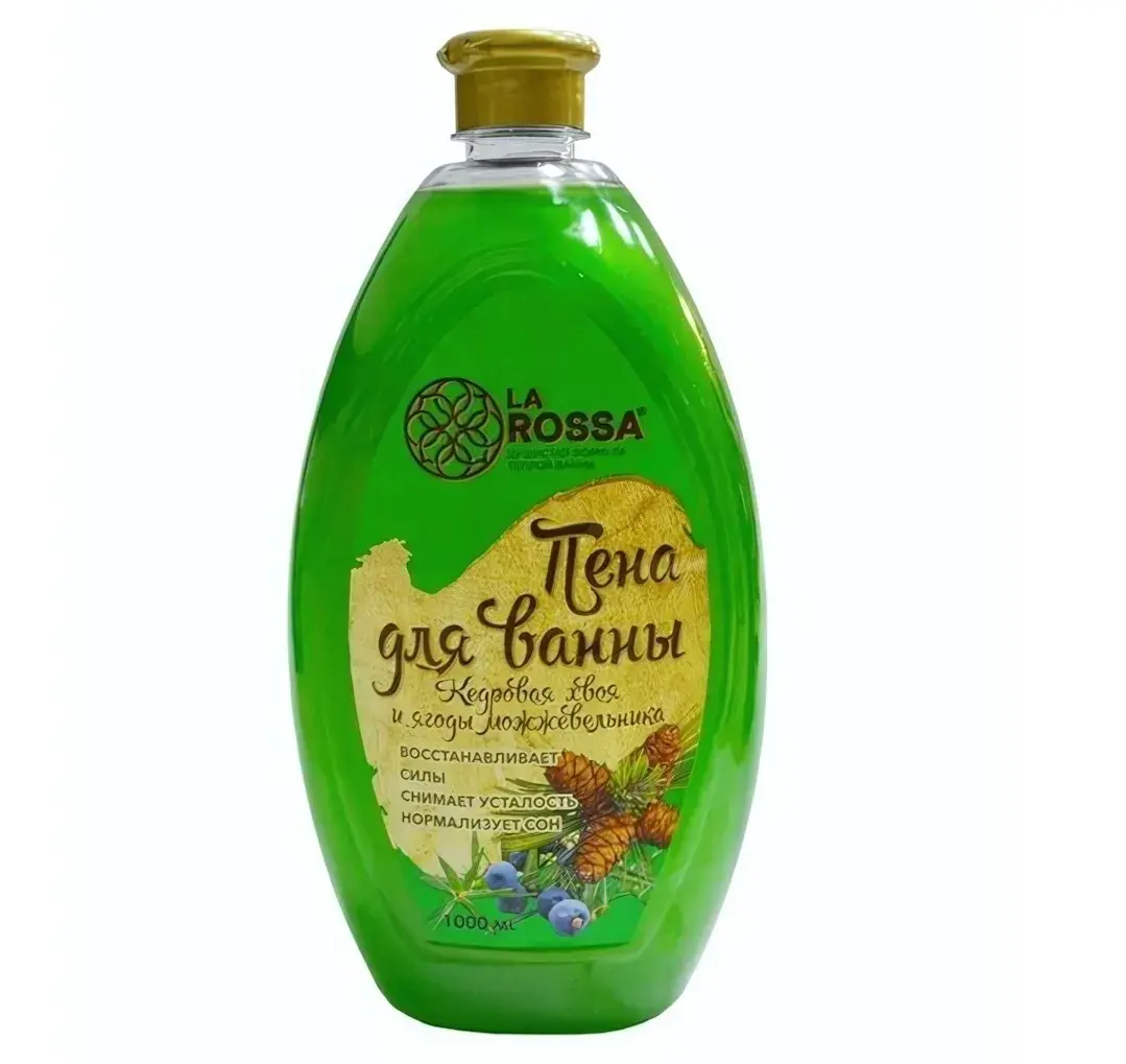 Объем бутылки составляет 1000 мл, что позволяет наслаждаться множеством расслабляющих процедур. Упаковка выполнена в зеленом цвете с овальной формой, что делает ее стильным дополнением к вашему интерьеру. Логотип LA ROSSA® и изображения хвойных шишек и ягод на этикетке подчеркивают натуральность и качество продукта.