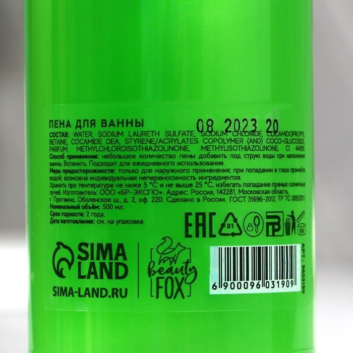 Пена для ванны упакована в стильный прозрачный флакон зеленого цвета с яркой этикеткой, которая привлекает внимание. Упаковка имеет удобную крышку, что позволяет легко дозировать продукт. Срок годности составляет 2 года, что делает его отличным выбором для долгосрочного использования. Храните пену в сухом месте при температуре от 5°C до 25°C для сохранения всех ее свойств.