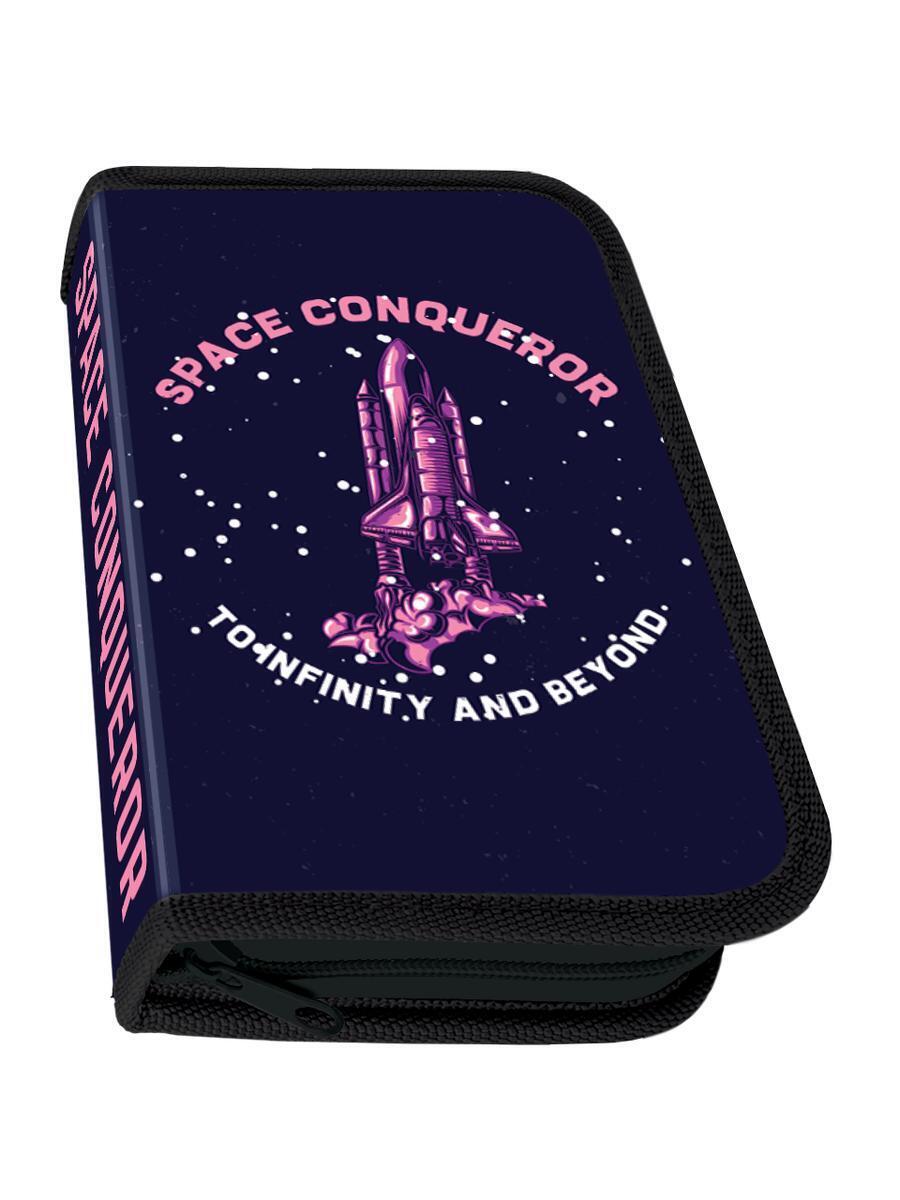 Тематический принт с надписями "SPACE CONQUEROR" и "TO INFINITY AND BEYOND" поддерживает интерес к наукам и исследовательской деятельности. Фон с белыми точками создает эффект звездного неба.