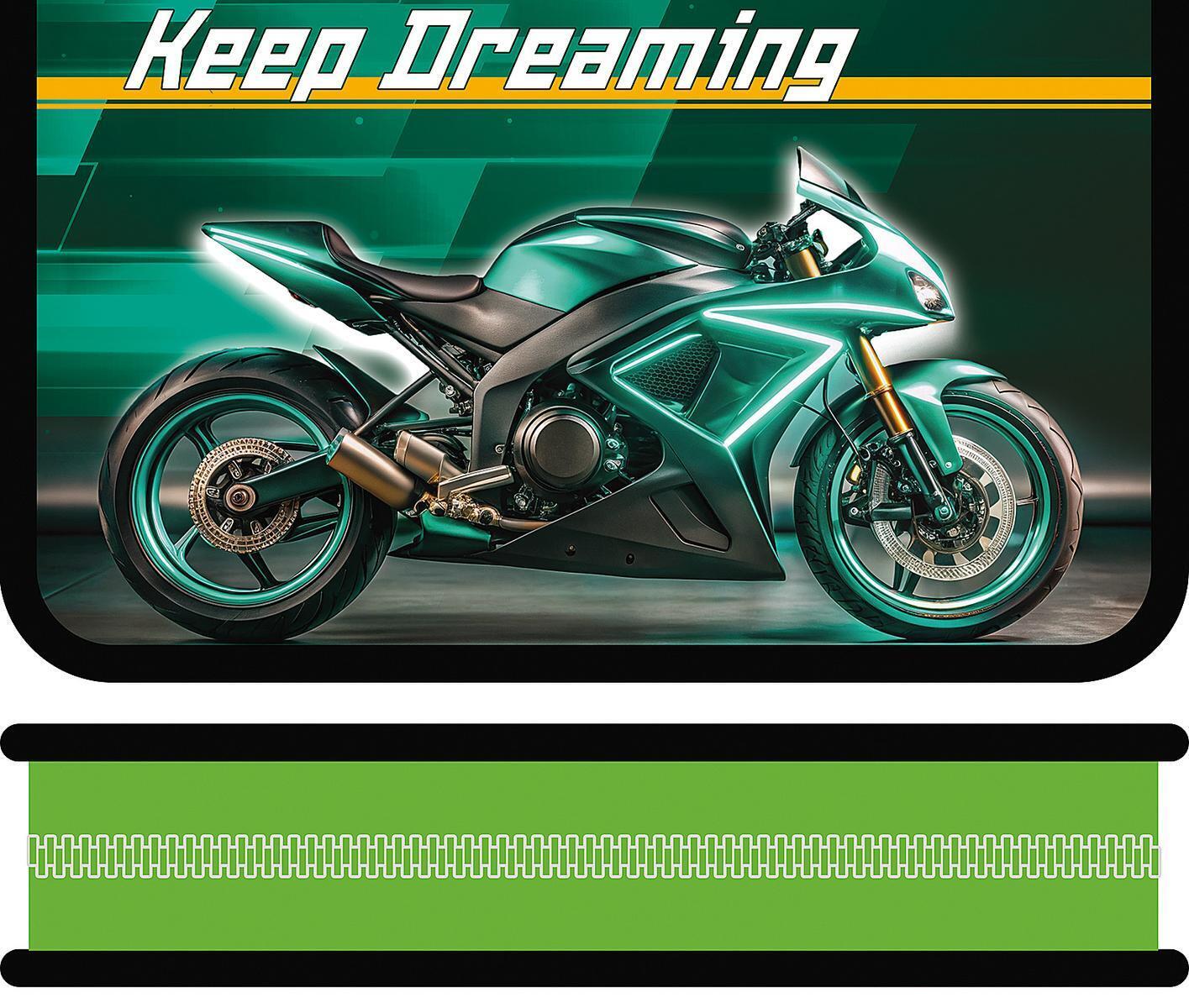 Практичный аксессуар с эксклюзивным дизайном мотоцикла мечты станет вашим надежным спутником в школе, офисе или путешествиях. Уникальная фольгированная поверхность с бирюзово-золотым принтом создает эффект 3D-графики, притягивая восхищенные взгляды.