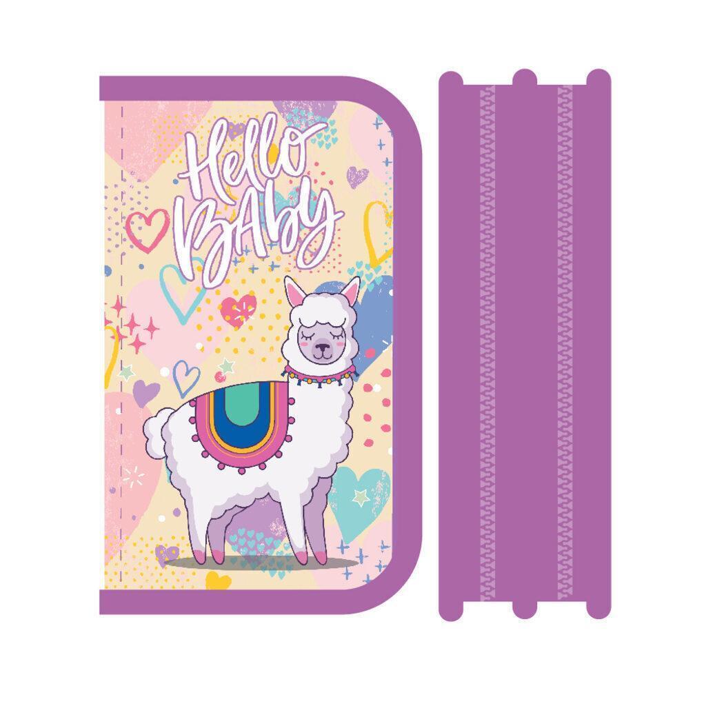 Яркая принтованная поверхность с мультяшными ламами и надписью «Hello Baby» создает праздничное настроение. Сочетание розового фона с разноцветными геометрическими элементами делает пенал заметным в школьном рюкзаке.