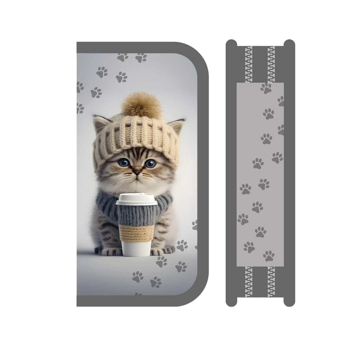 Дизайн "Котенок в шапке 2024" с нейтральной цветовой гаммой и аккуратным принтом с отпечатками лап подойдет как для младших школьников, так и для подростков. Это практичный аксессуар, который сочетает функциональность и привлекательный внешний вид, помогая поддерживать порядок каждый день.