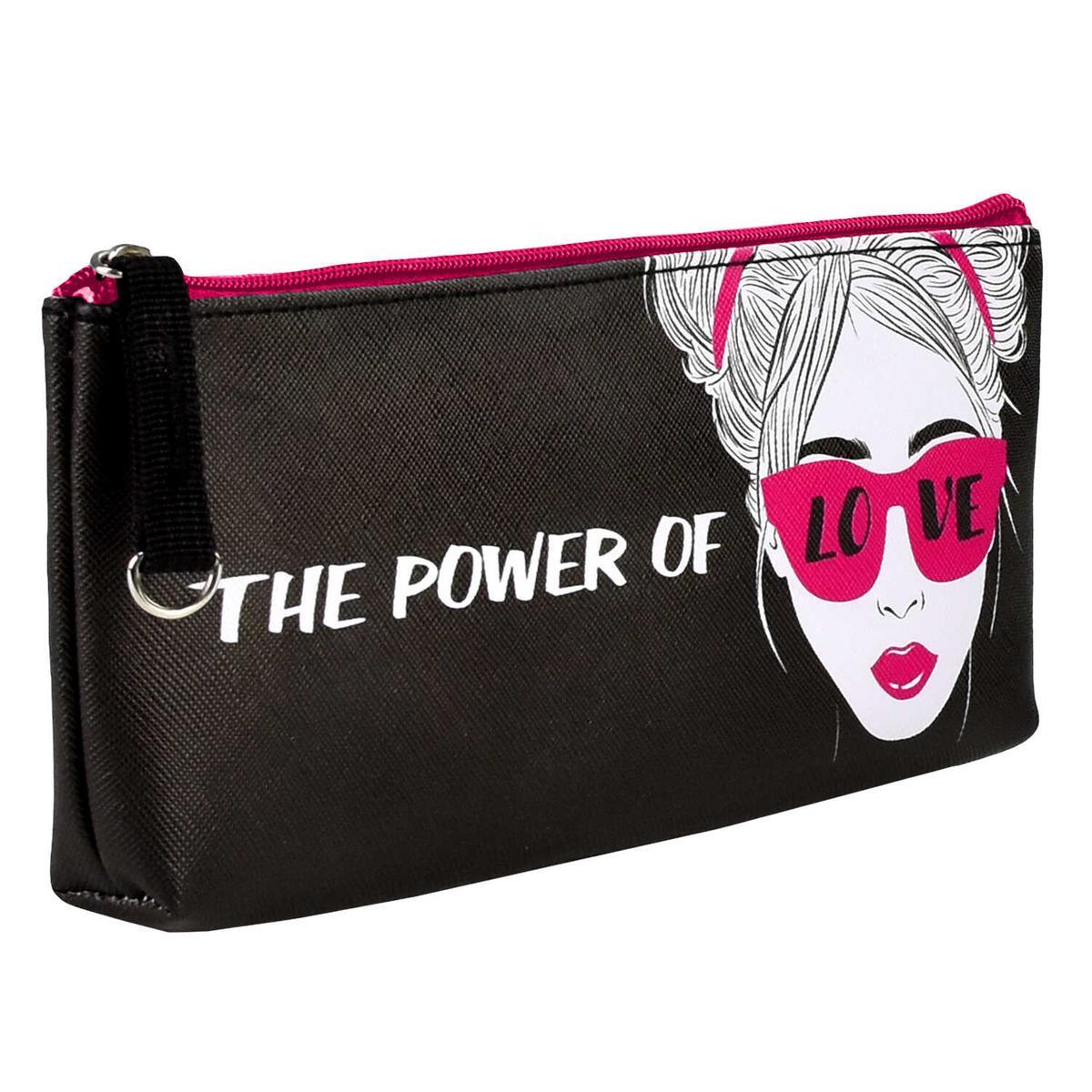 Пенал изготовлен из качественной искусственной кожи с водоотталкивающими свойствами. Прочный замок-молния обеспечивает надежное хранение ваших принадлежностей. Дизайн с изображением девушки в очках и надписью "THE POWER OF LOVE" придется по душе современным школьницам и студенткам.