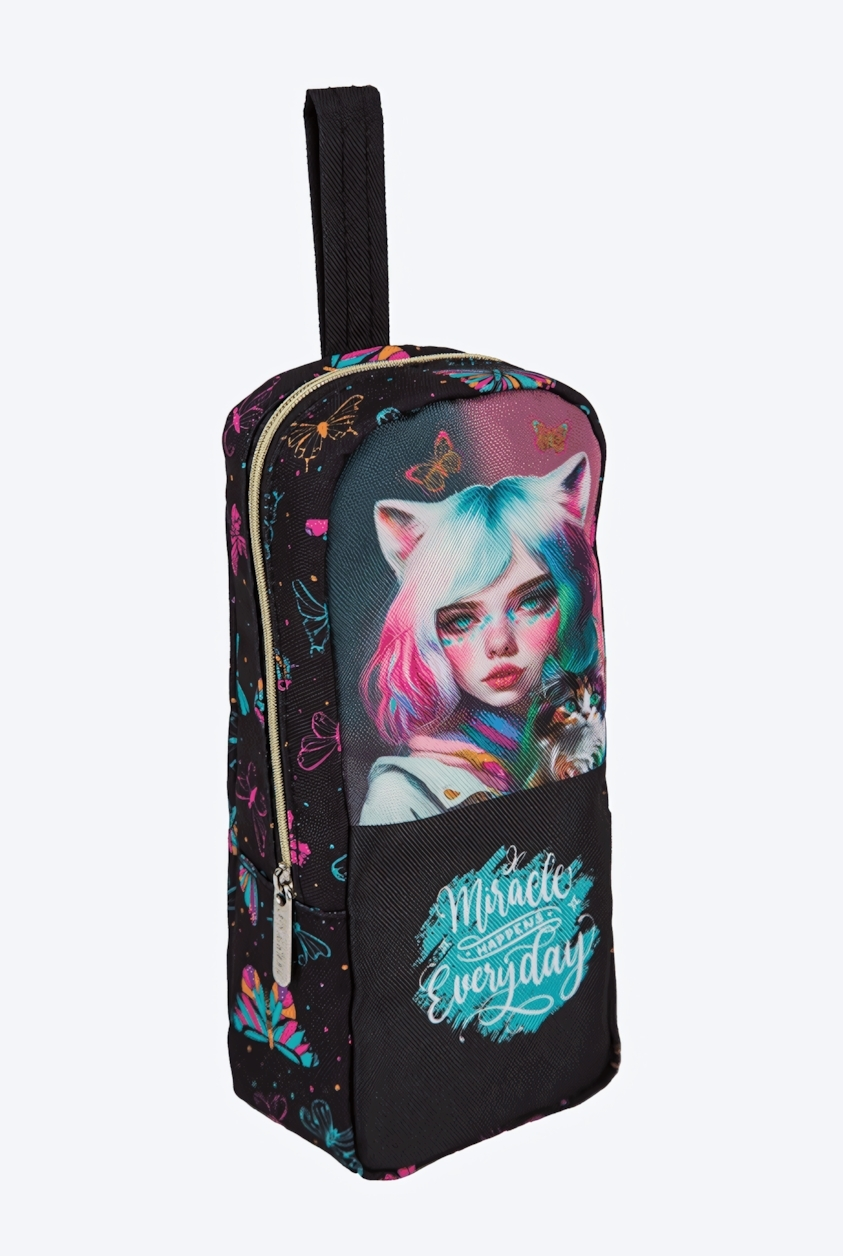 Пенал "Miracle" станет надежным помощником для школьников и студентов. Его яркий дизайн с изображением девушки-кошки и бабочек поднимет настроение каждый день.
