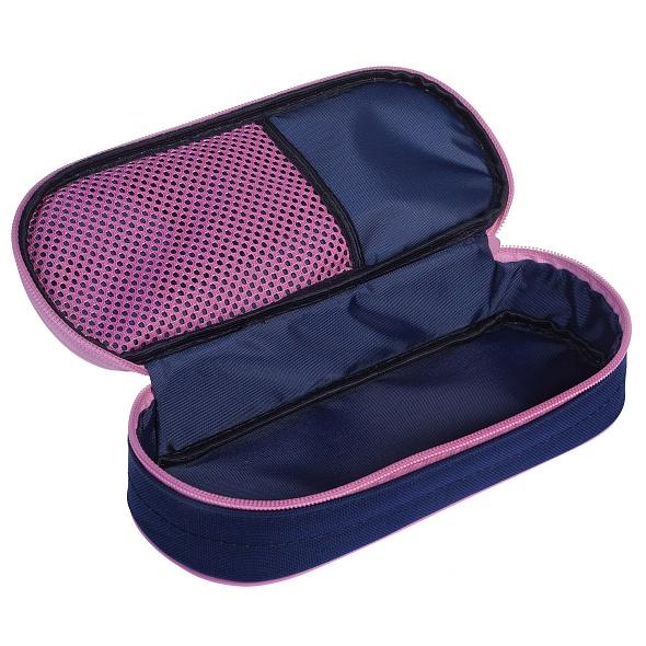 Гладкая внутренняя поверхность предотвращает царапины на принадлежностях, а контрастная расцветка в сине-розовых тонах делает аксессуар заметным в рюкзаке. Боковой карман на сетке позволяет быстро найти мелкие предметы без необходимости полностью открывать пенал.