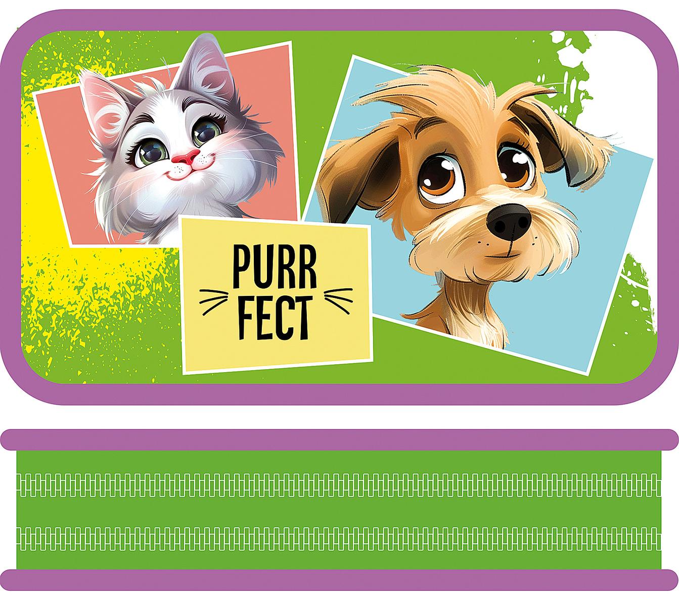Внешнее оформление пенала заслуживает особого внимания. Разноцветный принт с изображениями забавного кота и собаки в мультяшном стиле создаст позитивное настроение на весь учебный день. Сочетание нежных зеленых, фиолетовых и розовых оттенков делает этот аксессуар ярким акцентом в школьном образе. Дизайн дополнен стильной графикой, что придает изделию современный и завершенный вид.