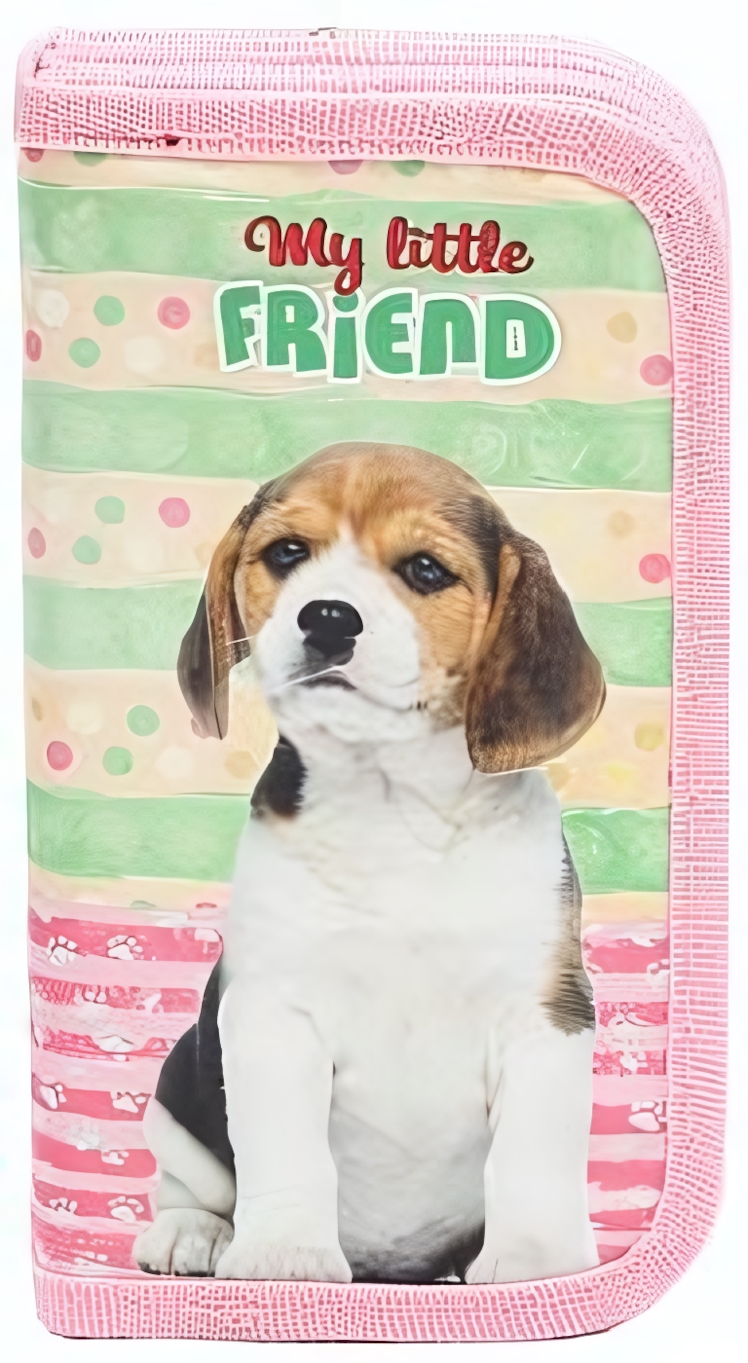 Пенал выполнен в светло-зеленом цвете с цветными полосками и обрамлением розовой окантовкой. На передней части изображена собака породы бультерьер с надписью "My little FRIEND". Размеры пенала компактные, что делает его удобным для хранения в рюкзаке. Этот пенал станет отличным подарком для любого любителя животных и стильных аксессуаров.