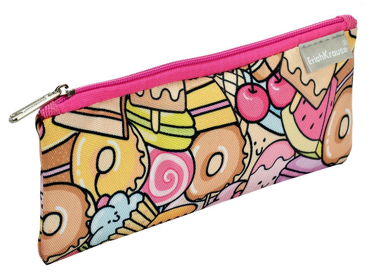 Этот легкий и удобный пенал-косметичка размером 220х90мм станет вашим надежным помощником в путешествиях, школе или дома. Благодаря яркому мультяшному дизайну с изображениями сладостей и пастельной цветовой гамме он отлично подойдет детям и подросткам, придаст настроение и создаст уют. Изготовлен из износостойкого, водоотталкивающего полиэстера, который легко чистится и долго сохраняет внешний вид.