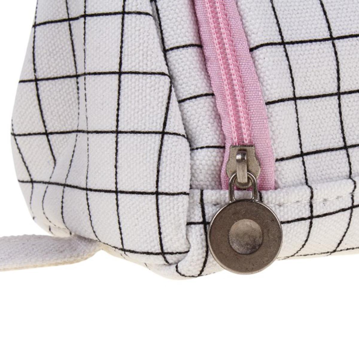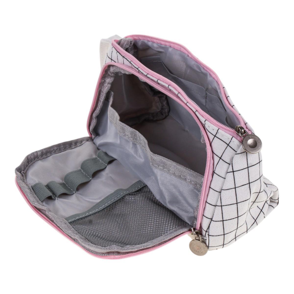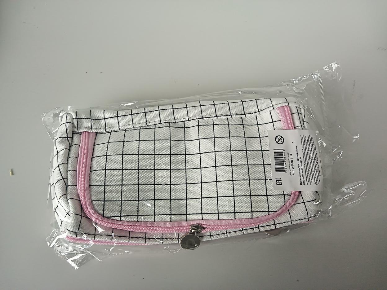 Благодаря компактным размерам и продуманной конструкции косметичка занимает минимум места, но вмещает всё необходимое. Сочетание белого фона с графичной черной сеткой создаёт стильный контраст, а розовая фурнитура добавляет яркий акцент. Материал устойчив к загрязнениям — достаточно протереть влажной салфеткой.