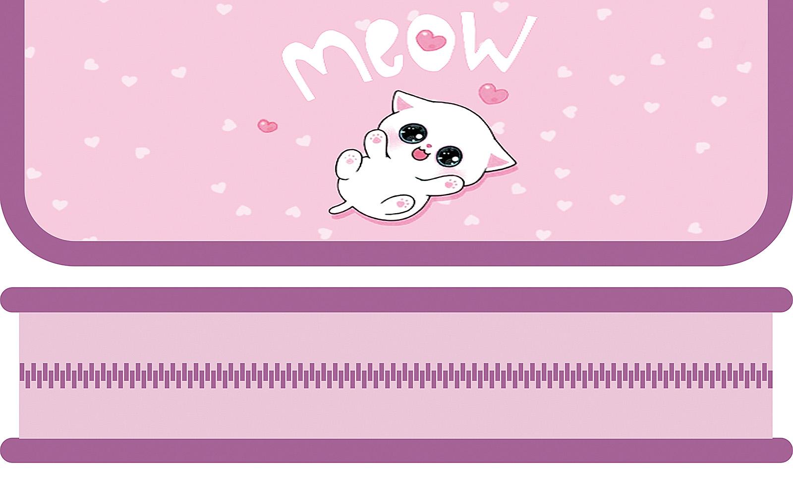 Главная особенность модели — нежный розовый фон с узором из сердечек и милое изображение белого котенка. Дизайн дополнен стильной надписью "meow", что делает пенал современным и привлекательным. Качественный принт устойчив к истиранию, поэтому любимый герой будет радовать глаз долгое время, сохраняя первоначальный вид даже при активном ежедневном использовании в школьном рюкзаке.