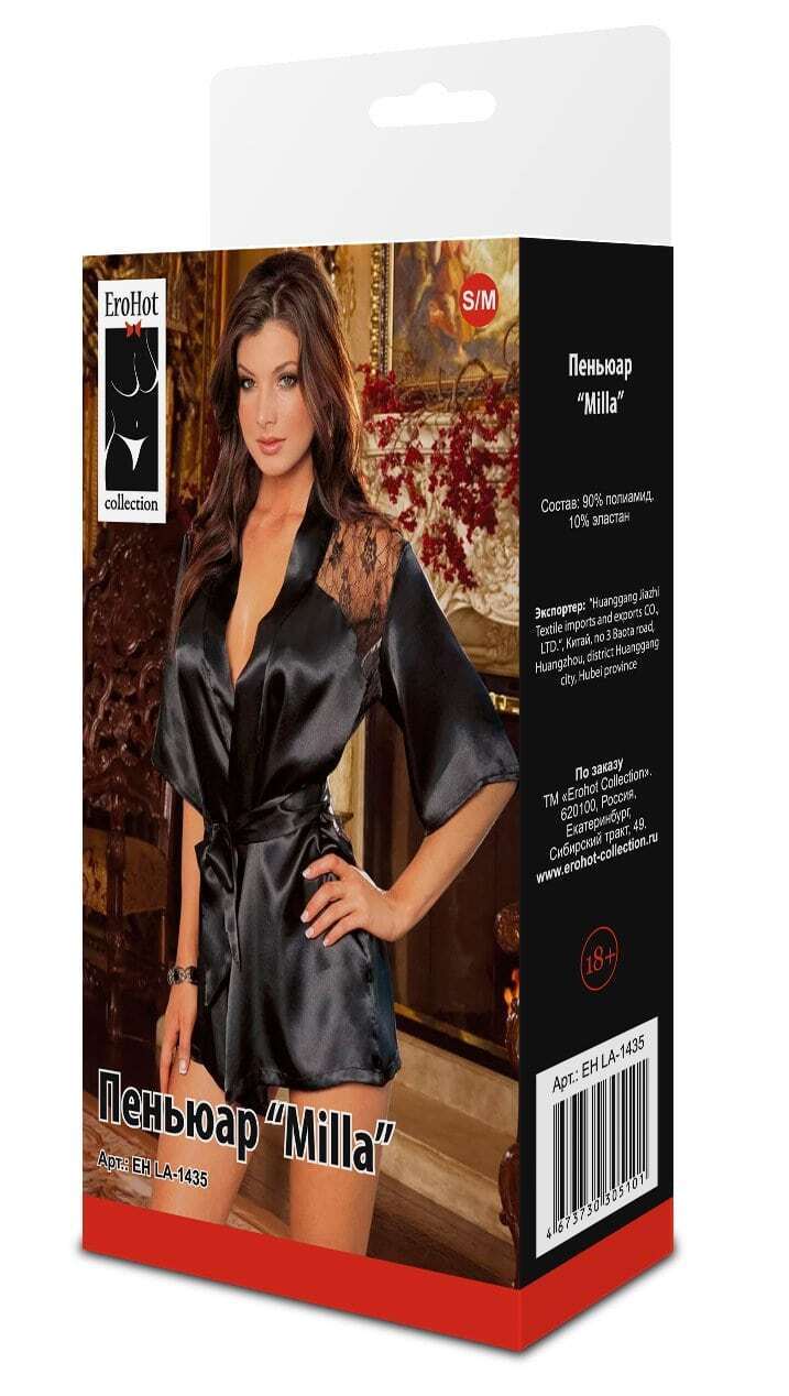 Пеньюар 'Milla' черный S, атлас с гипюром, с поясом и трусиками