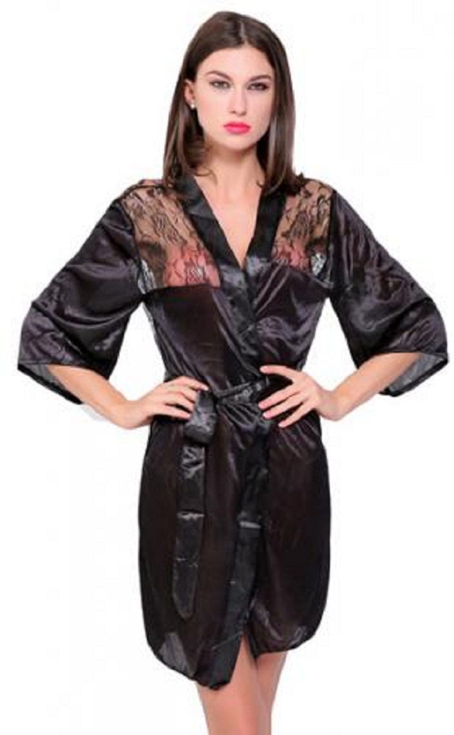Пеньюар атласный с гипюром 'Sensual', черный, размер S, трусики в комплекте
