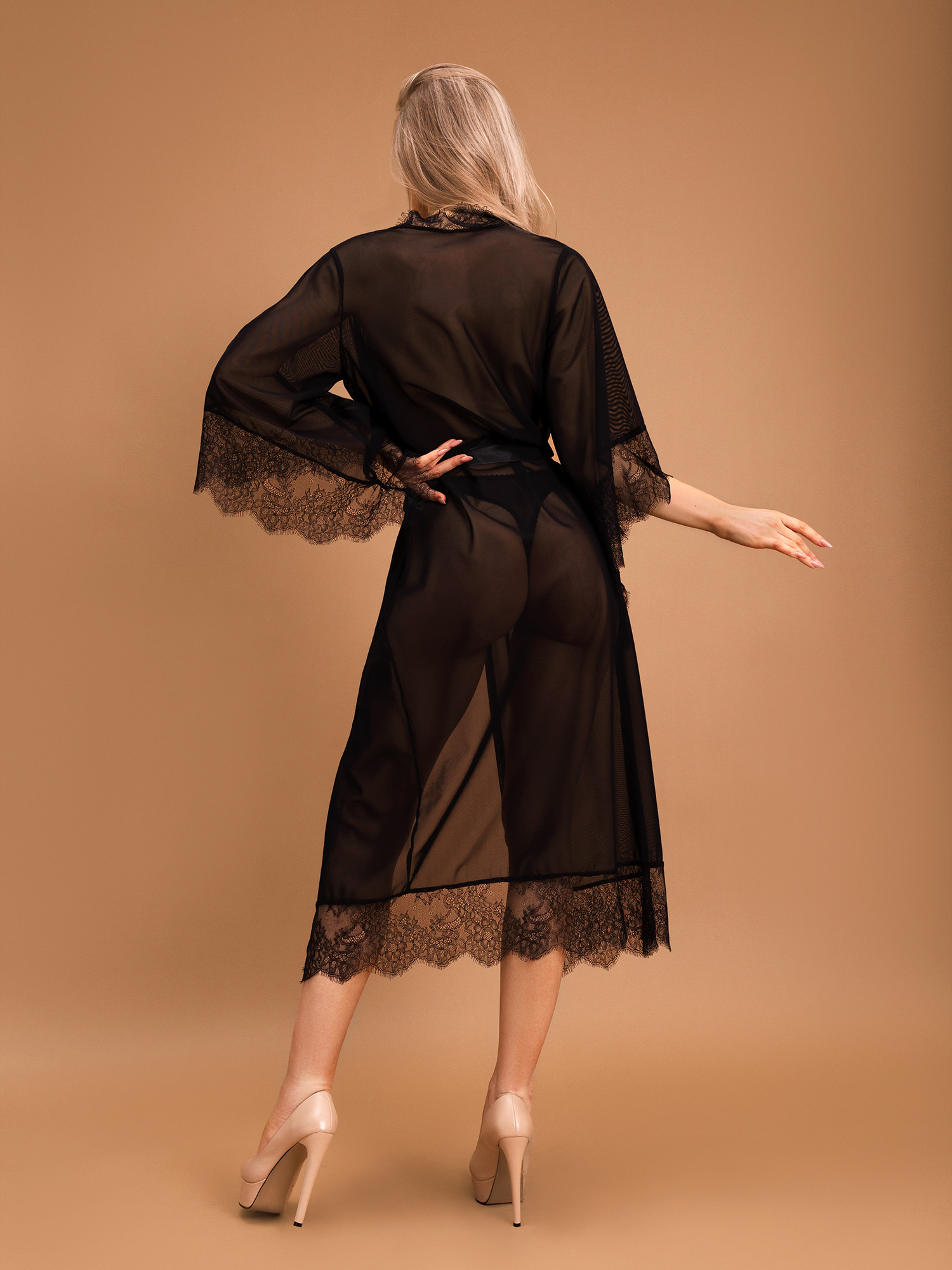 Этот черный пеньюар с кружевной отделкой создан для тех, кто хочет выглядеть изысканно и привлекательно. Он выполнен из легкой прозрачной сетки, что позволяет подчеркнуть красоту женского тела, оставаясь при этом загадочным. Пеньюар идеально подходит для романтических вечеров или уютных домашних моментов, когда вы хотите чувствовать себя комфортно и уверенно.