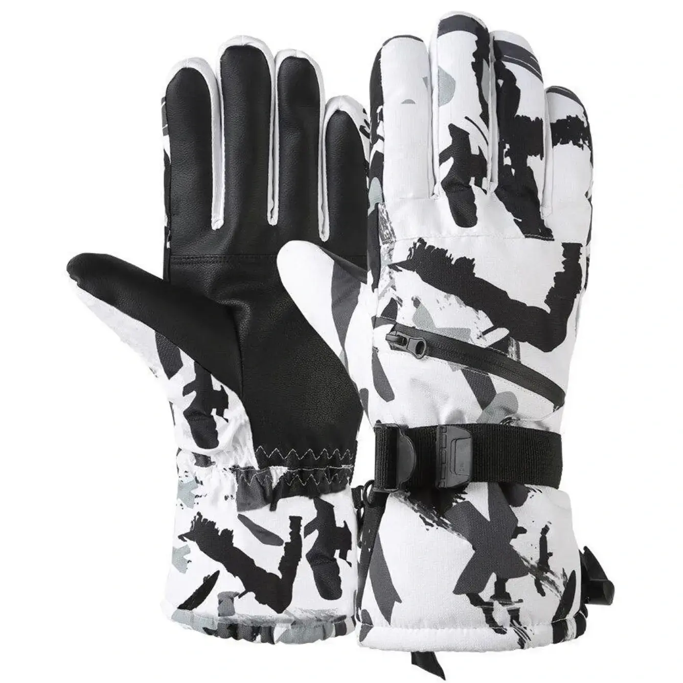 Перчатки имеют размеры L, что подходит для большинства взрослых пользователей. Их черно-белая расцветка с камуфляжным узором делает их универсальными для сочетания с различной зимней одеждой. Эластичный манжет и регулируемый ремешок обеспечивают надежную посадку, предотвращая попадание снега и холода внутрь.