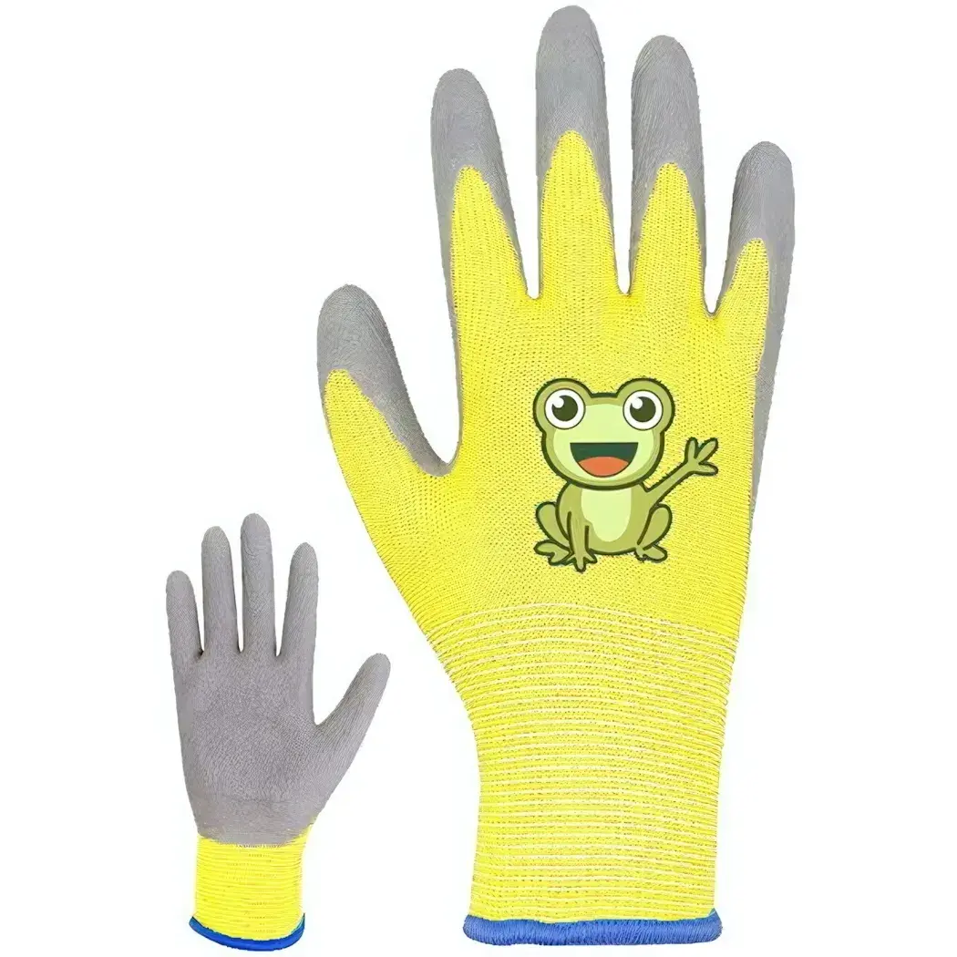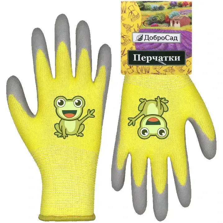 Перчатки выполнены из нейлона с полиуретановым покрытием, что обеспечивает их долговечность и защиту от влаги. Эластичный манжет с синим цветом надежно фиксирует перчатки на руке, предотвращая их соскальзывание. Кроме того, анатомическая форма перчаток обеспечивает удобство при использовании, а рисунок с лягушонком добавляет элемент веселья в процесс работы.