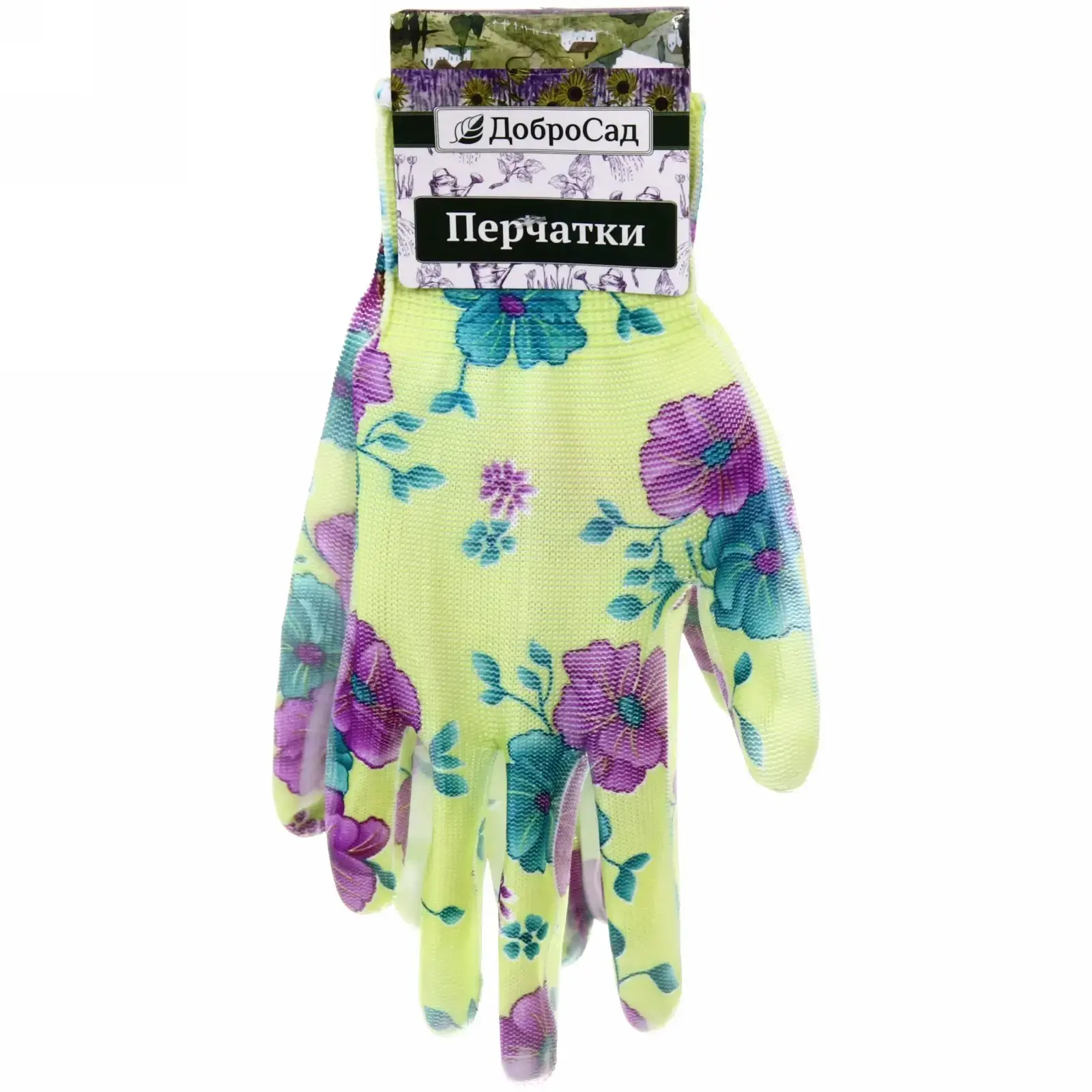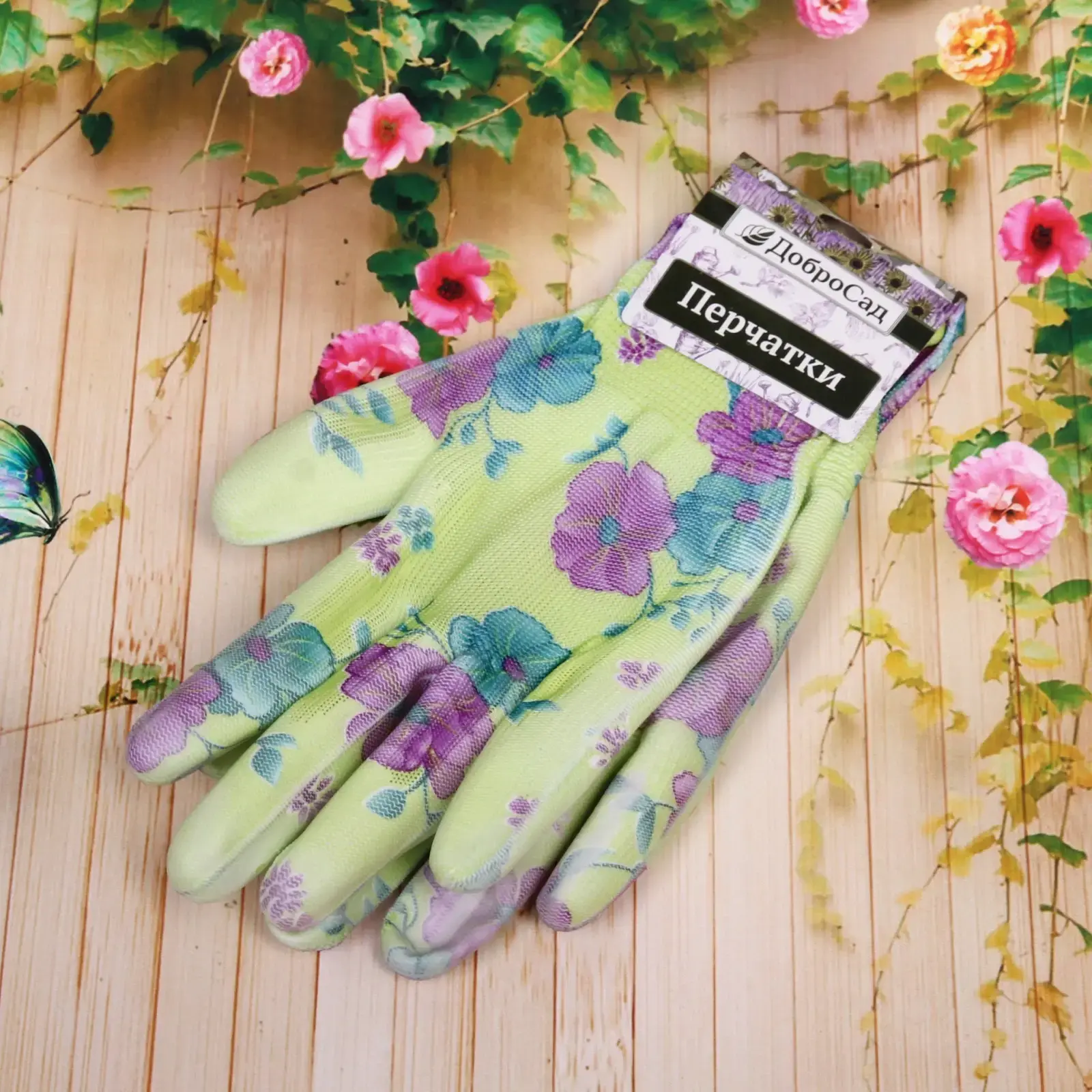 Перчатки изготовлены из прочного нейлона с декоративным цветочным принтом фиолетовых и голубых оттенков на желтом фоне. Полуоблитое ПВХ покрытие гарантирует надежный захват инструментов и защиту от влаги.