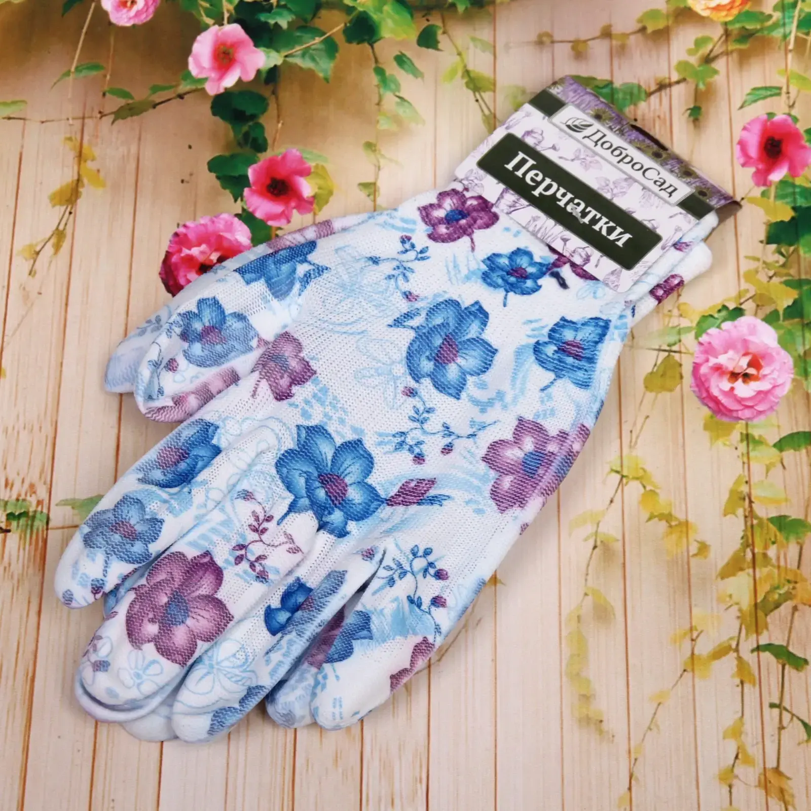 Белые перчатки с изящным цветочным рисунком в сине-фиолетовых тонах станут вашим надежным помощником на даче. Манжет на запястье предотвращает попадание грязи, а текстурированная поверхность обеспечивает отличный захват инструментов.