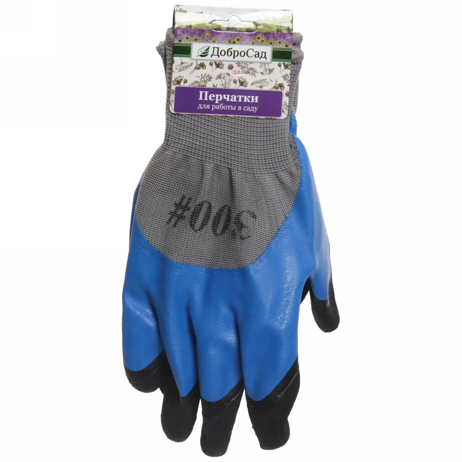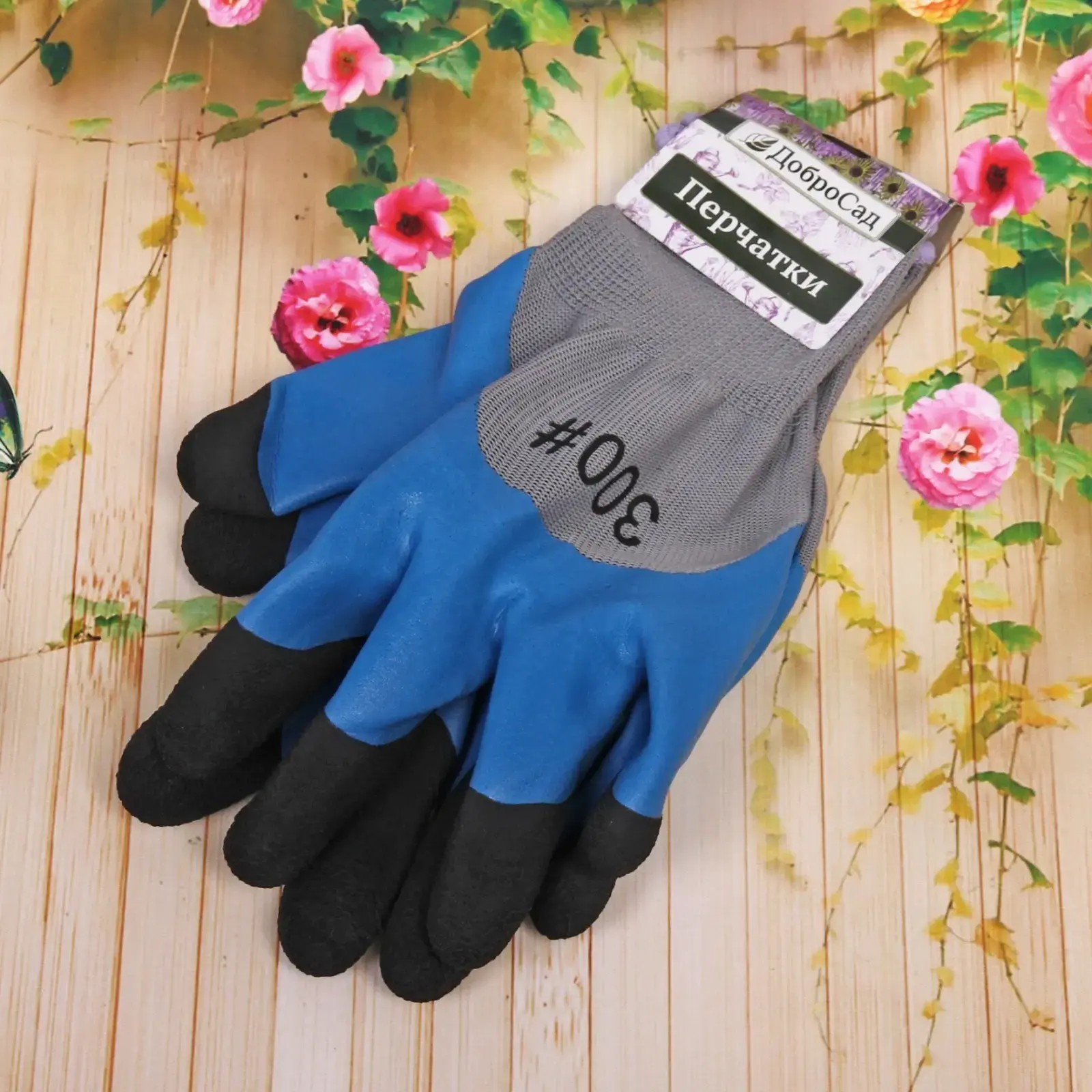 Перчатки имеют размер 10 и выполнены в ярком синем цвете с черными акцентами. Верхняя часть изготовлена из нейлона, что обеспечивает легкость и комфорт, а резиновое покрытие на ладонях и пальцах гарантирует долговечность и защиту от влаги. Эти перчатки станут незаменимым помощником в вашем саду или на даче.