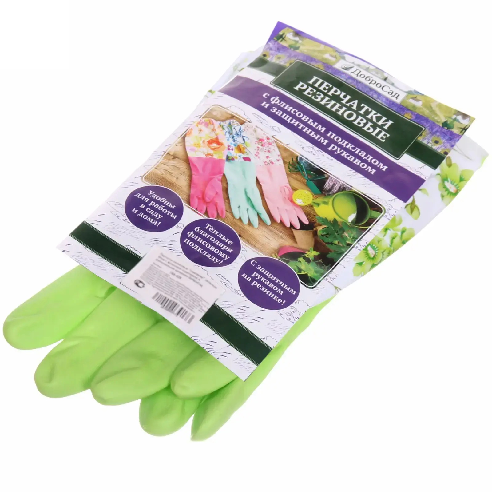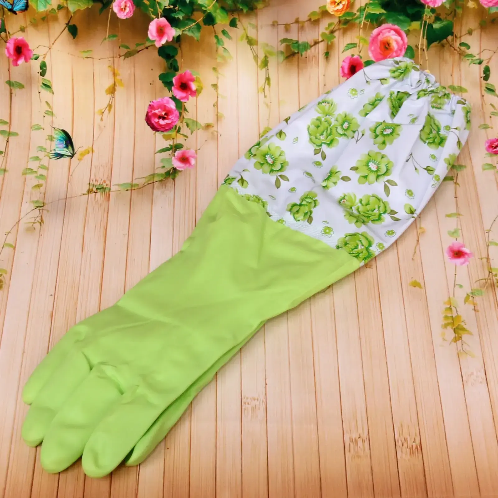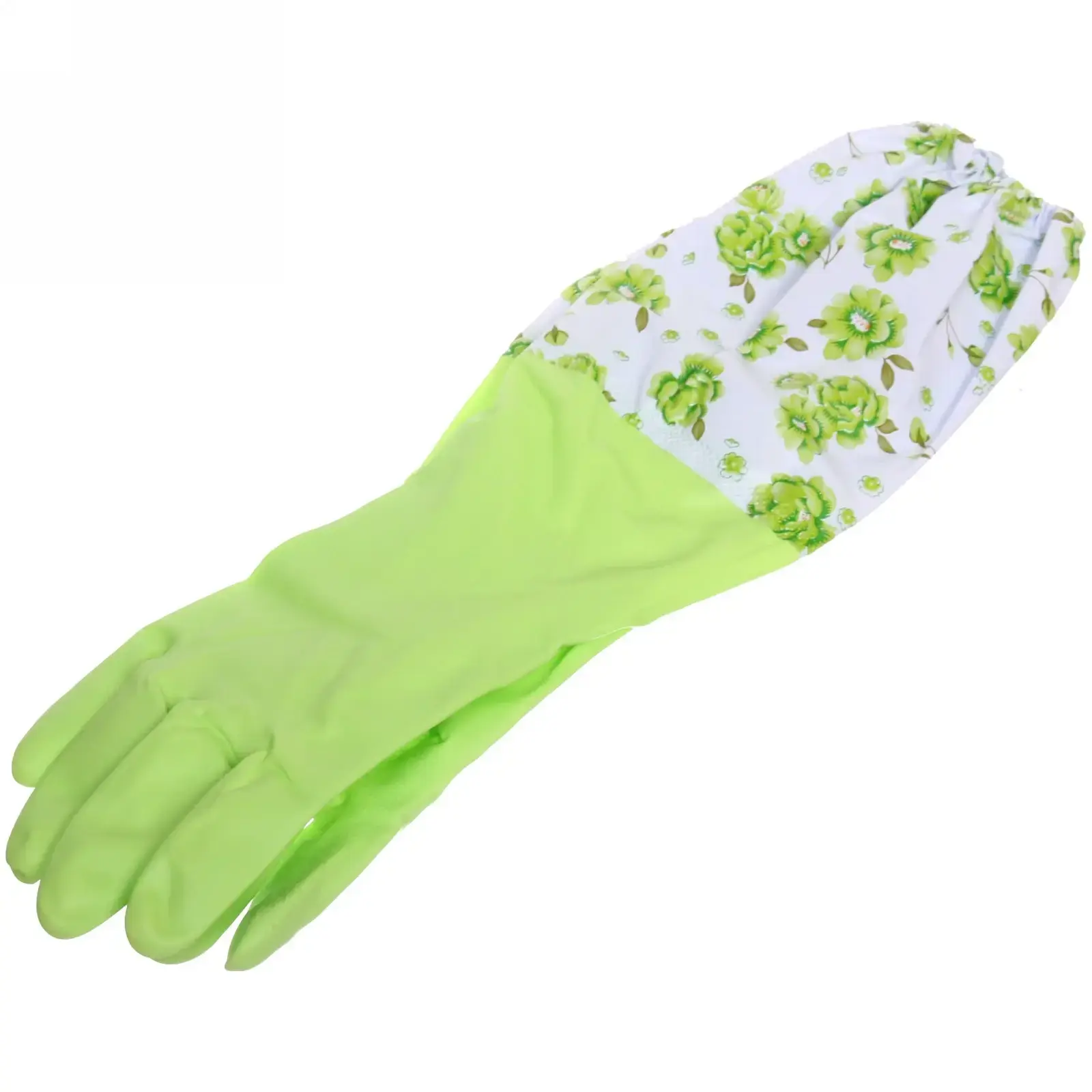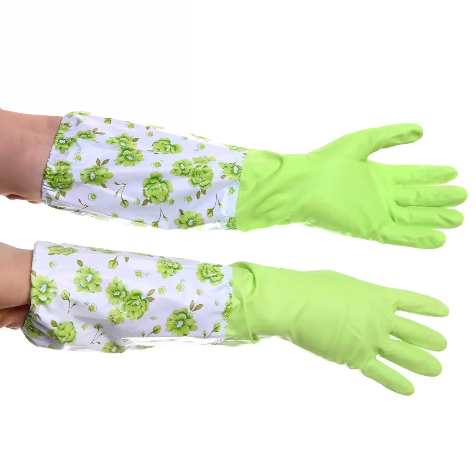 Перчатки имеют стильный зеленый цвет и цветочный принт, что делает их не только функциональными, но и привлекательными. Они легко чистятся и быстро сохнут, что позволяет использовать их многократно. Размер 45 см подходит для большинства пользователей, обеспечивая надежную посадку и защиту.