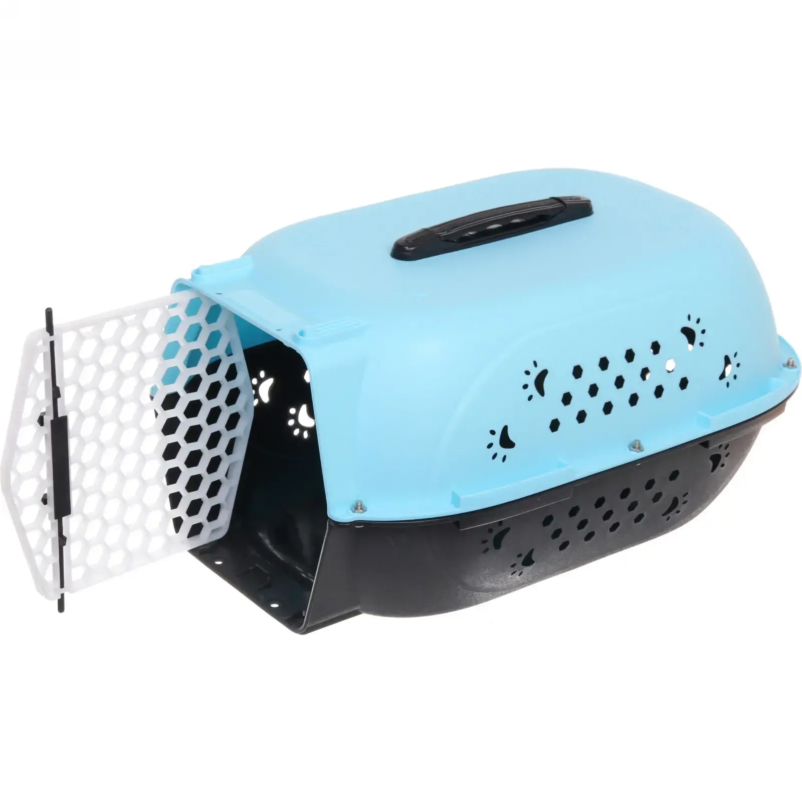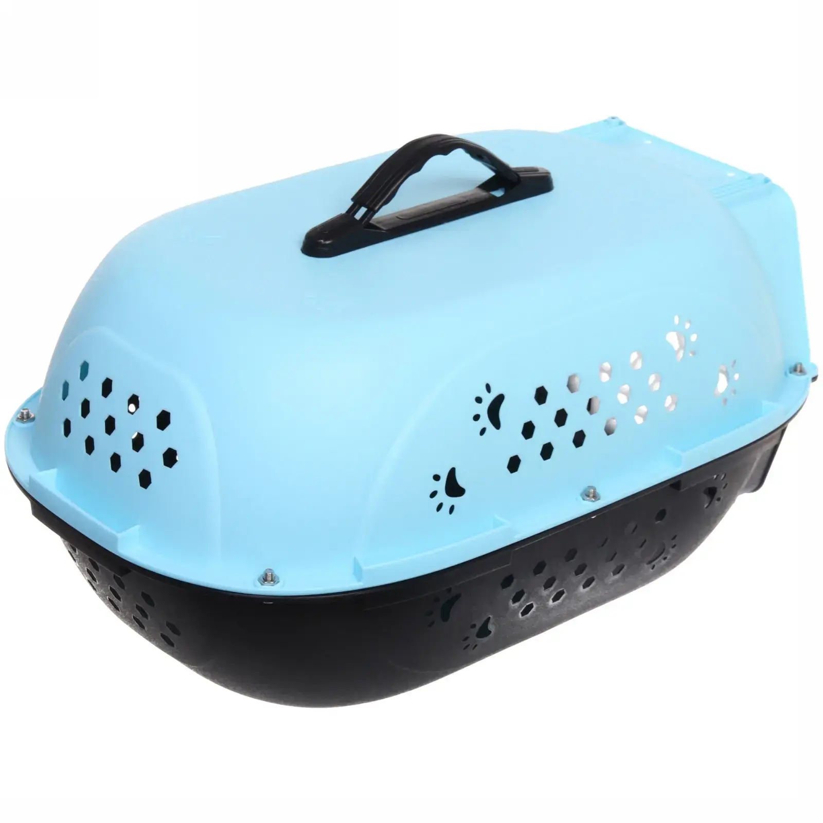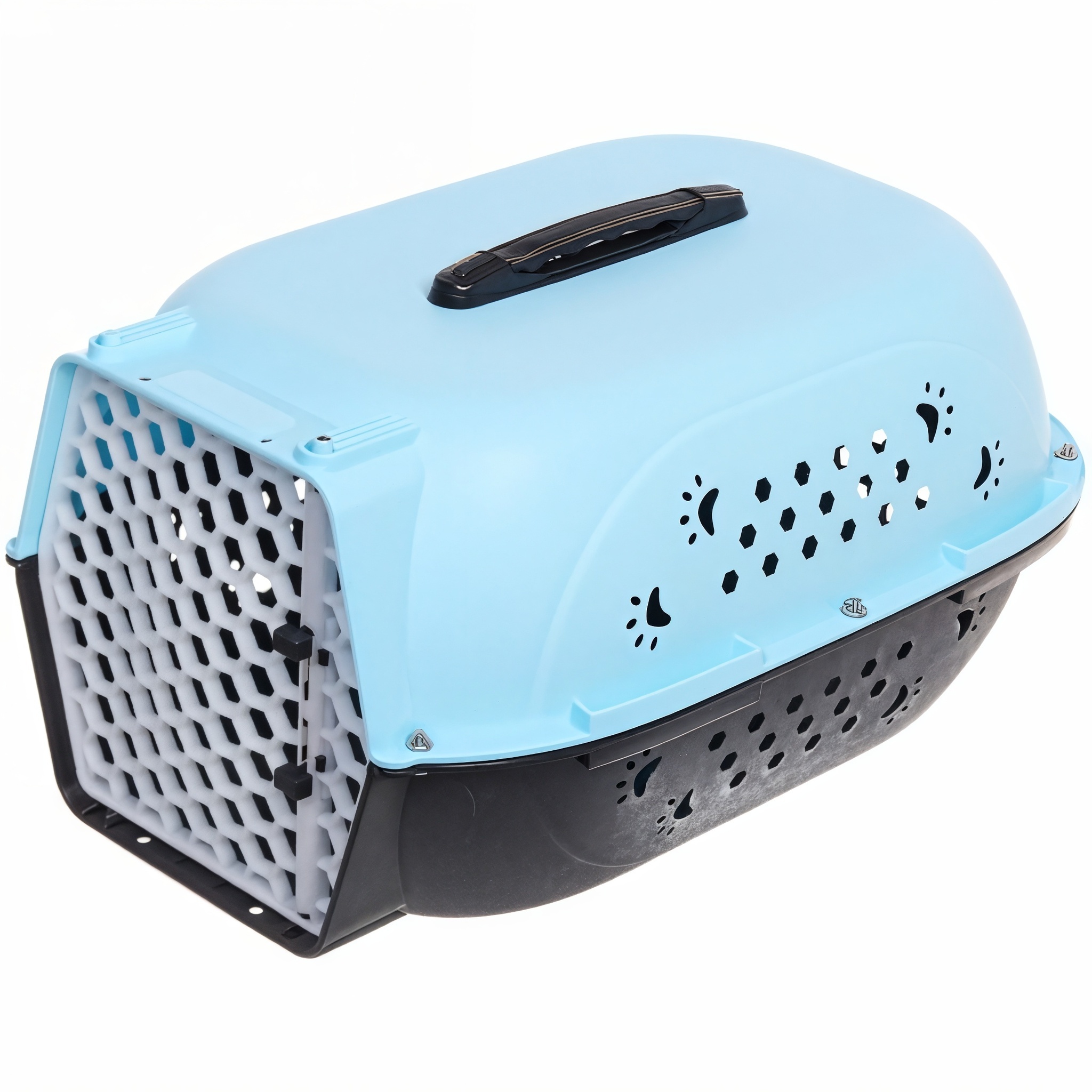 Переноска сочетает эстетику и функциональность: двухцветный дизайн (голубой верх + черный низ) подчеркивает стиль, а закругленные углы защищают животное от травм. Внутреннее пространство размером 48×32×26 см достаточно для комфортного размещения кошек и собак весом до 9 кг. Съемная нижняя панель упрощает чистку, а усиленное дно с антискользящими элементами гарантирует устойчивость.