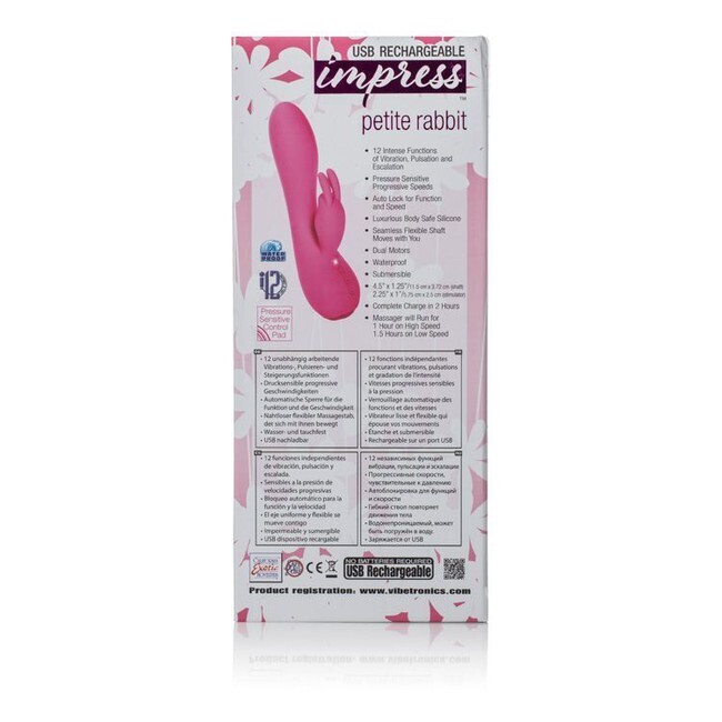 Вибромассажер 'IMPRESS Petite Rabbit' имеет длину 11,5 см и диаметр 3,25 см, что делает его удобным для использования. Он выполнен из безопасного для тела силикона, что гарантирует долговечность и легкость в уходе. В комплект входит зарядное USB-устройство, что делает его использование еще более удобным.